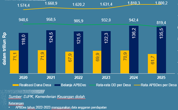 Dana Desa cenderung meningkatan setiap tahun sejalan dengan kemampuan keuangan negara dan komitmen pemerintah dalam memperkuat pembangunan desa. Sejak tahun 2015, Dana Desa meningkat signifikan dari Rp20,8 Triliun (2015) menjadi 71,1 Triliun (2020) dan Outlook Dana Desa 2025 sebesar Rp61,7 Triliun dengan total akumulasi sebesar Rp668,2 triliun. Pendapatan Desa yang bersumber tidak hanya dari APBN tetapi juga terdapat dari 6 sumber lainnya sesuai dengan UU Desa. Besarnya dana yang dikelola desa perlu diimbangi dengan kewenangan jelas dan peningkatan kapasitas perangkat desa agar pengelolaan keuangan semakin akuntabel dan efektif.