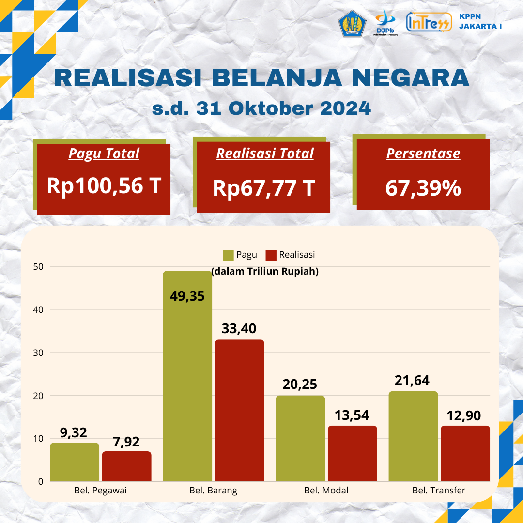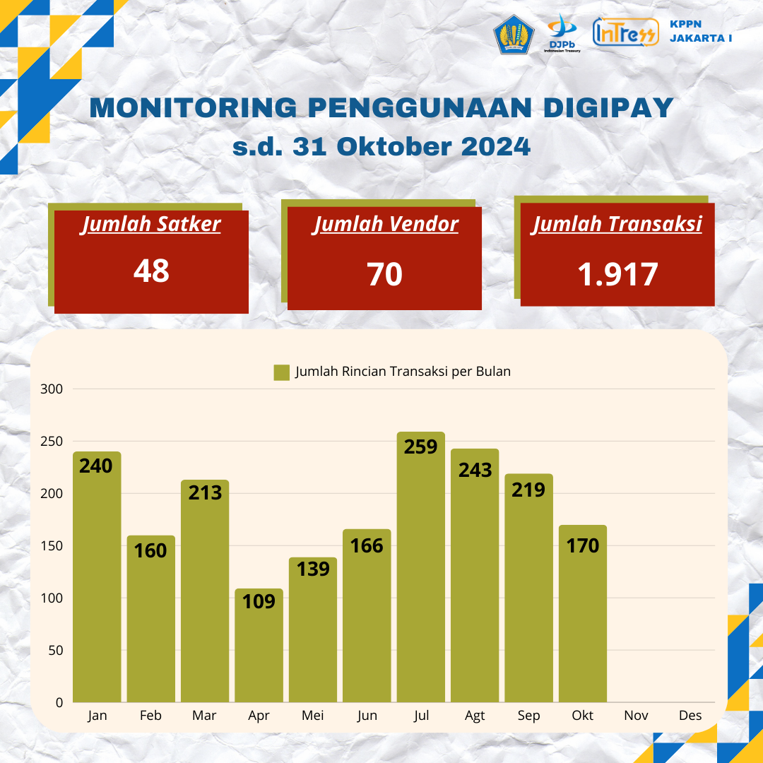 JAKARTA - Sampai dengan bulan Oktober 2024, KPPN Jakarta I telah berupaya untuk mengawal penyaluran APBN dengan profesional. Selain itu, KPPN Jakarta I juga mendorong implementasi Digipay Satu pada seluruh Satuan Kerja mitranya. Berikut merupakan ringkasan/publikasi terkait progres realisasi penyaluran APBN dan progres implementasi Digipay Satu lingkup wilayah kerja KPPN Jakarta I periode sampai dengan 31 Oktober 2024.