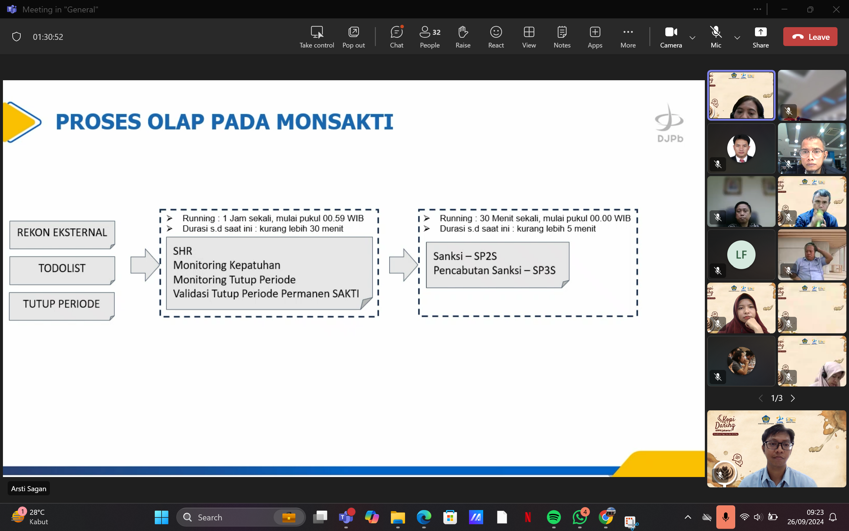 Kegiatan dilaksanakan secara daring melalui Aplikasi Ms Teams. Bertindak sebagai narasumber adalah Sdri. Arsti Sagan. Dalam paparannya, narasumber menyampaikan mengenai seluk beluk proses OLAP pada Aplikasi MONSAKTI yang berdampak pada pelaksanaan kegiatan rekonsiliasi UAKPA dan penyelesaian To Do List. Beliau juga menyampaikan bahwa Seksi Vera KPPN Jakarta I telah melayani stakeholders dalam proses rekonsiliasi UAKPA secara sigap pada setiap periodenya. Kegiatan yang dihadiri oleh seluruh pegawai KPPN Jakarta I ini ditutup dengan arahan dari Kepala KPPN Jakarta I. Dalam arahannya, beliau menyampaikan apresiasi atas dilaksanakannya kegiatan sharing knowledge ini. Selain itu, beliau juga menyampaikan pesan antikorupsi dan himbauan agar para pegawai melaksanakan pekerjaan dengan penuh rasa tanggung jawab dan menjunjung tinggi integritas.