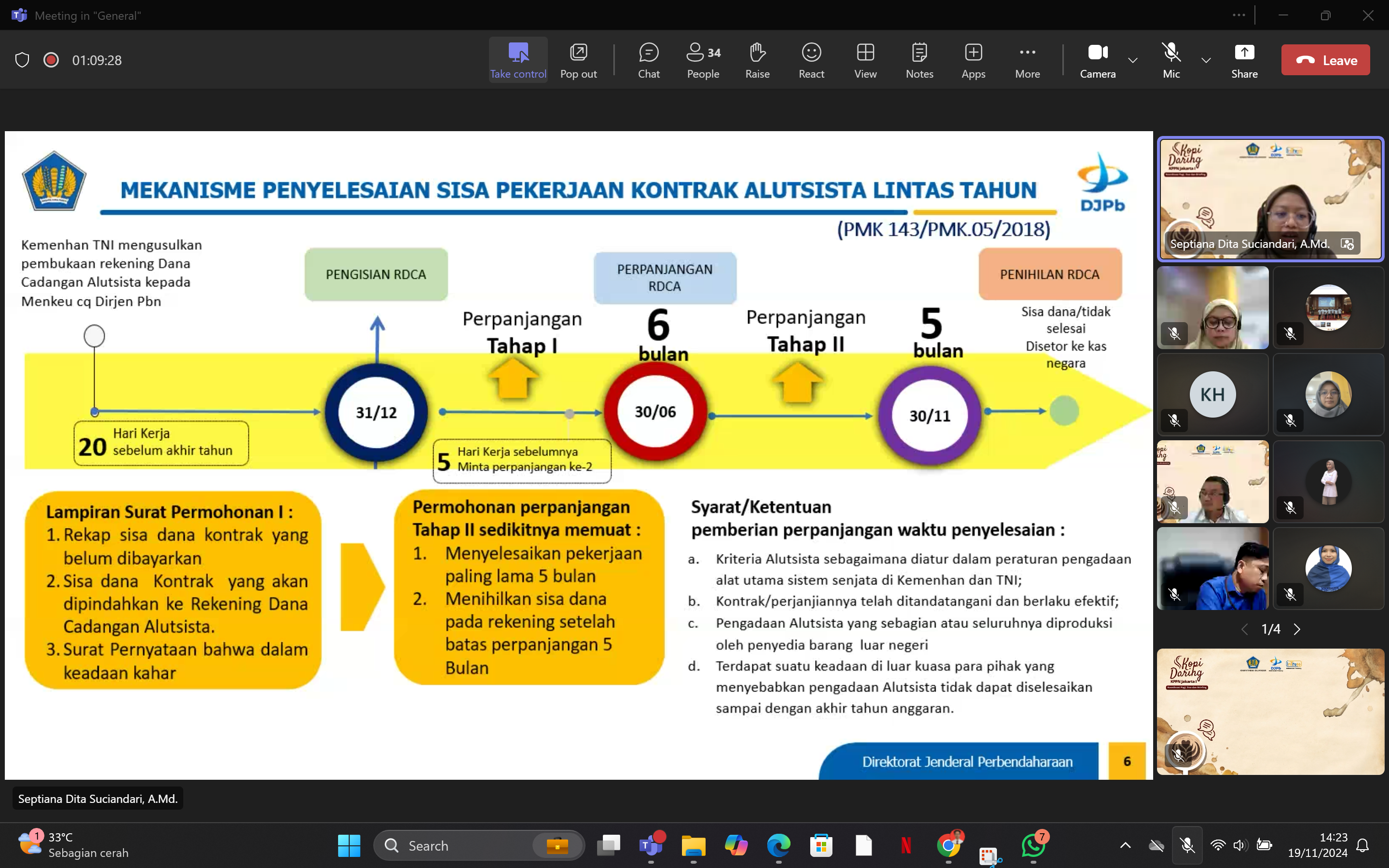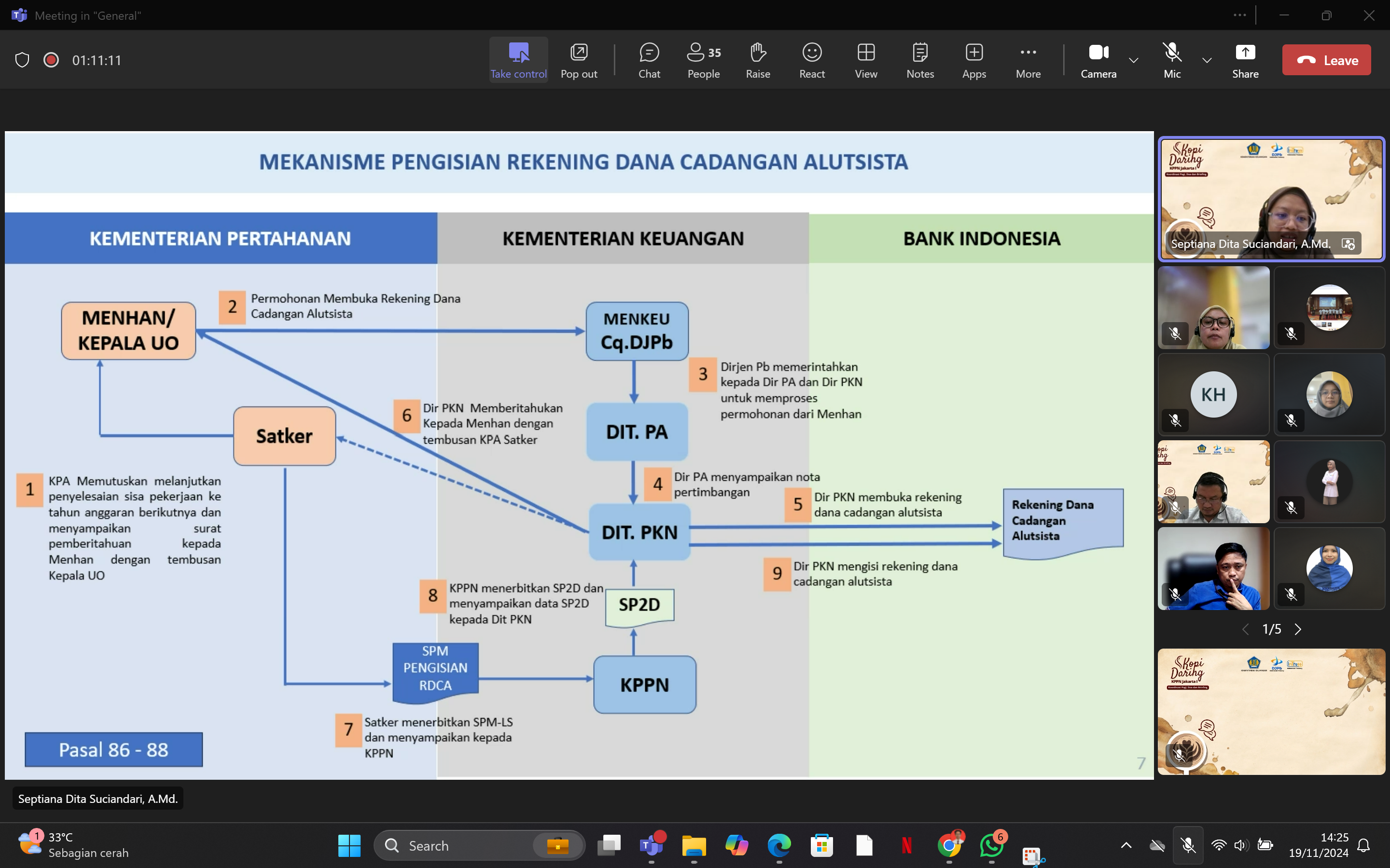 Rapat yang dibuka oleh Bapak Ikhwan Noor Hidayat, Kepala Seksi Pencairan Dana, memulai pembahasan dengan apresiasi kepada peserta dan memberikan penjelasan umum tentang pelaksanaan Rekening Dana Cadangan Alutsista (RDCA). Tujuannya adalah memastikan pemahaman mengenai kebijakan yang diatur dalam PMK Nomor 143/PMK.05/2018.