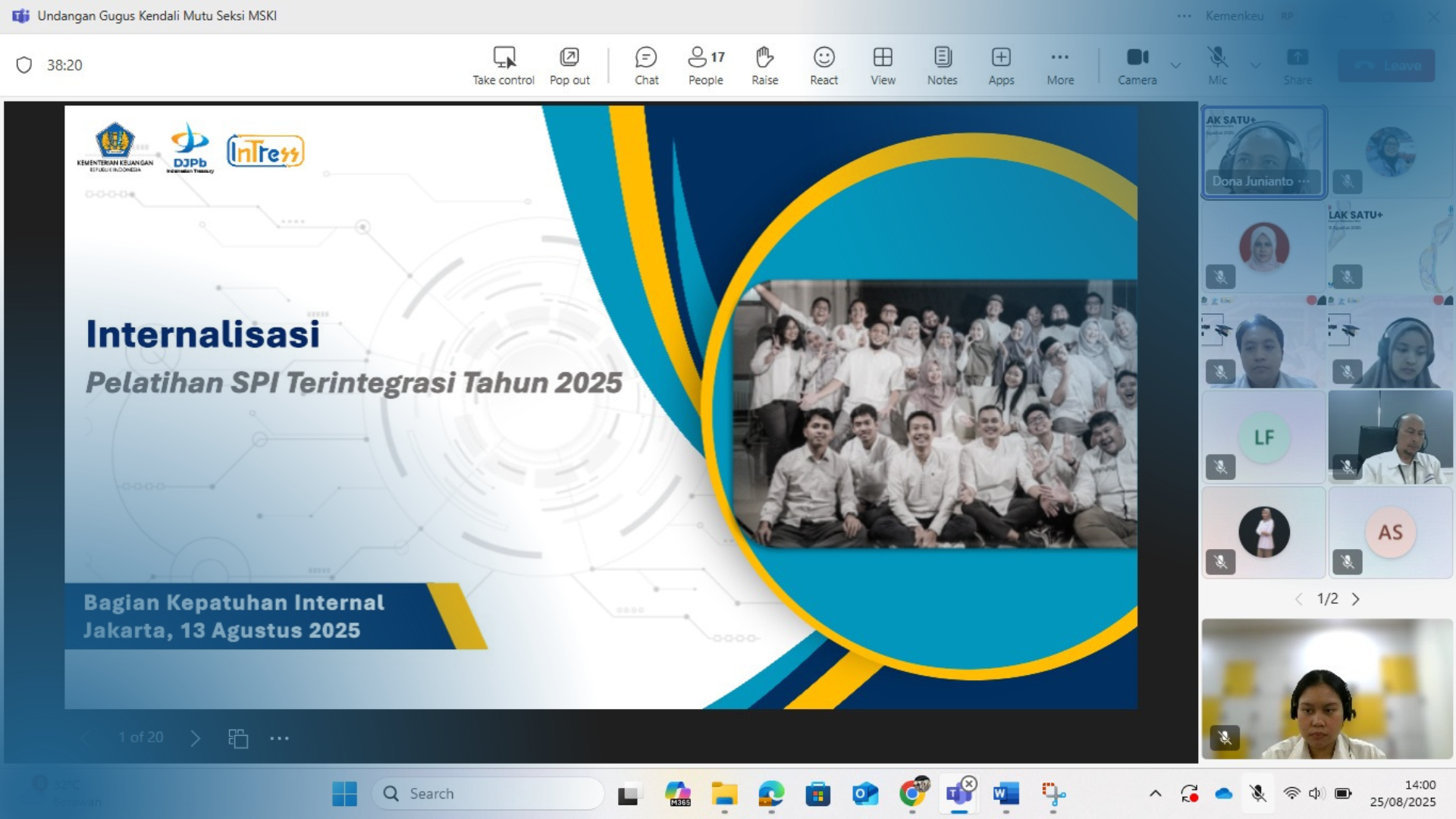 JAKARTA - KPPN Jakarta I kembali menyelenggarakan rapat internal pada Senin, 25 Agustus 2025 secara daring melalui aplikasi Microsoft Teams. Rapat berlangsung mulai pukul 14.00 hingga 15.00 WIB, diikuti oleh para pejabat dan pegawai KPPN Jakarta I. Agenda utama rapat kali ini meliputi pembahasan Sistem Pengendalian Intern (SPI) Terintegrasi, Survei Penilaian Integritas (SPI) 2025, serta penguatan komunikasi, transparansi, dan perilaku etis dalam pelaksanaan tugas sehari-hari.