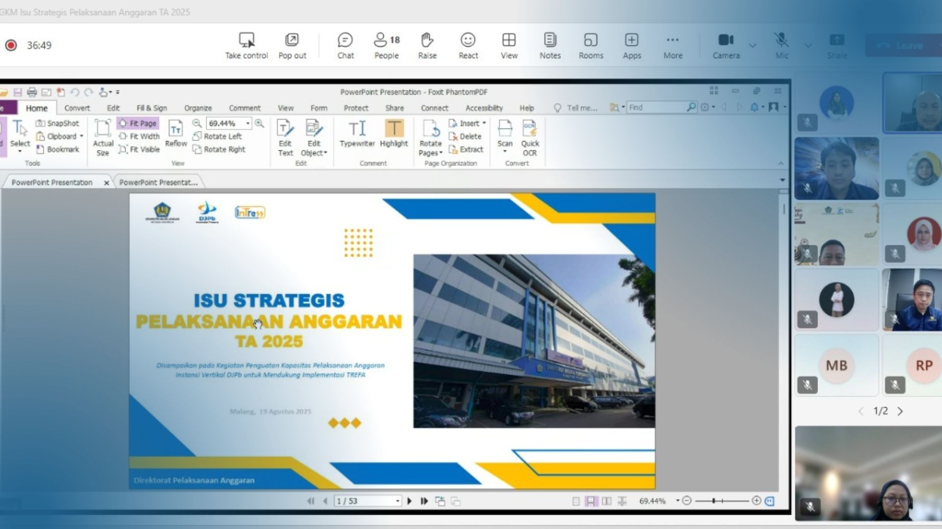 JAKARTA - KPPN Jakarta I menggelar kegiatan GKM Seksi Pencairan Dana dengan topik utama Isu Strategis Pelaksanaan Anggaran Tahun Anggaran 2025. Rapat yang dilaksanakan secara daring melalui MS Teams pada Rabu (27/08) ini diikuti oleh seluruh pejabat dan pegawai KPPN Jakarta I.