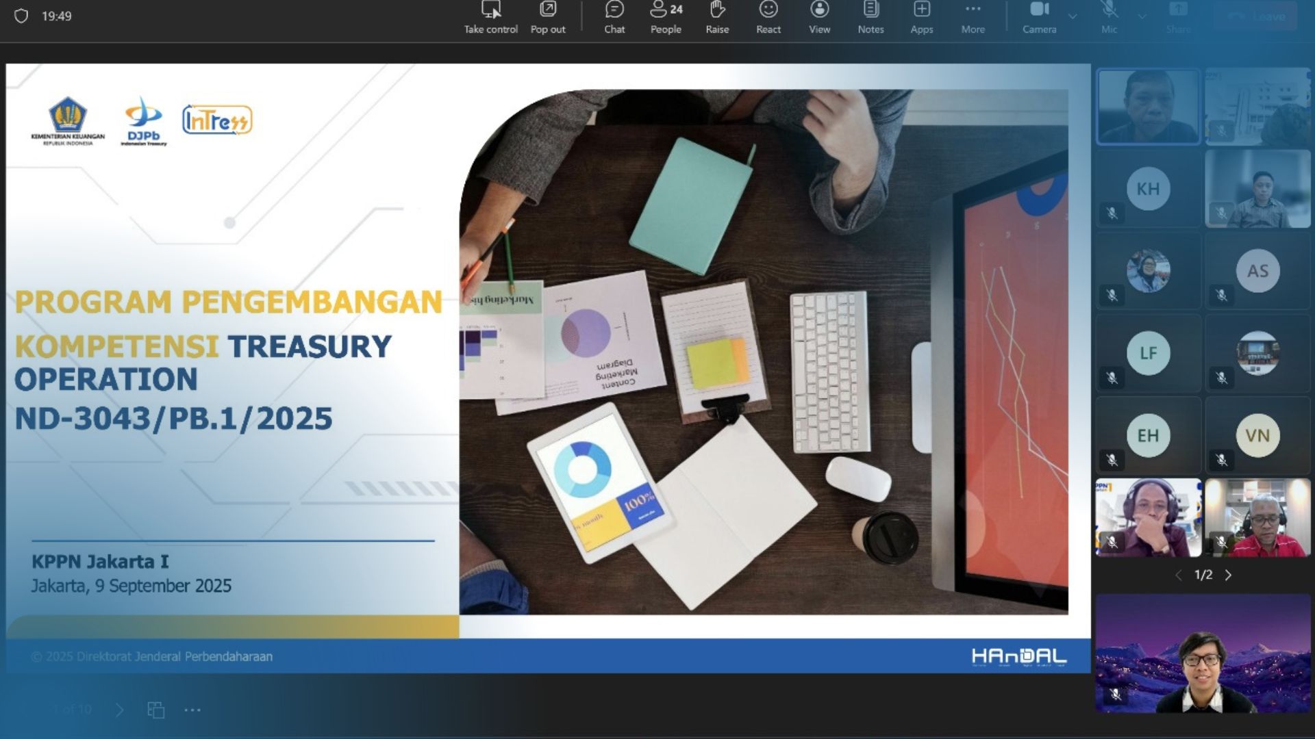 JAKARTA - KPPN Jakarta I kembali menyelenggarakan kegiatan Gugus Kendali Mutu (GKM) pada Selasa, 9 September 2025 secara daring melalui MS Teams. Agenda kali ini mengusung topik Penyusunan Individual Development Plan (IDP) Semester II Tahun 2025 serta pengenalan Program Treasury Operation (TO) Tahun 2025.