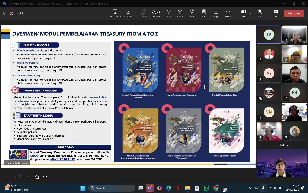 Kegiatan ini diintegrasikan dengan penyusunan IDP Semester II Tahun 2025. Setiap pegawai wajib mencantumkan modul Treasury From A to Z sebagai pembelajaran wajib, serta menambahkan minimal satu kompetensi teknis atau manajerial dengan kombinasi dua model pembelajaran: self-learning (wajib) dan pilihan structured learning, social learning, atau learning from experience.