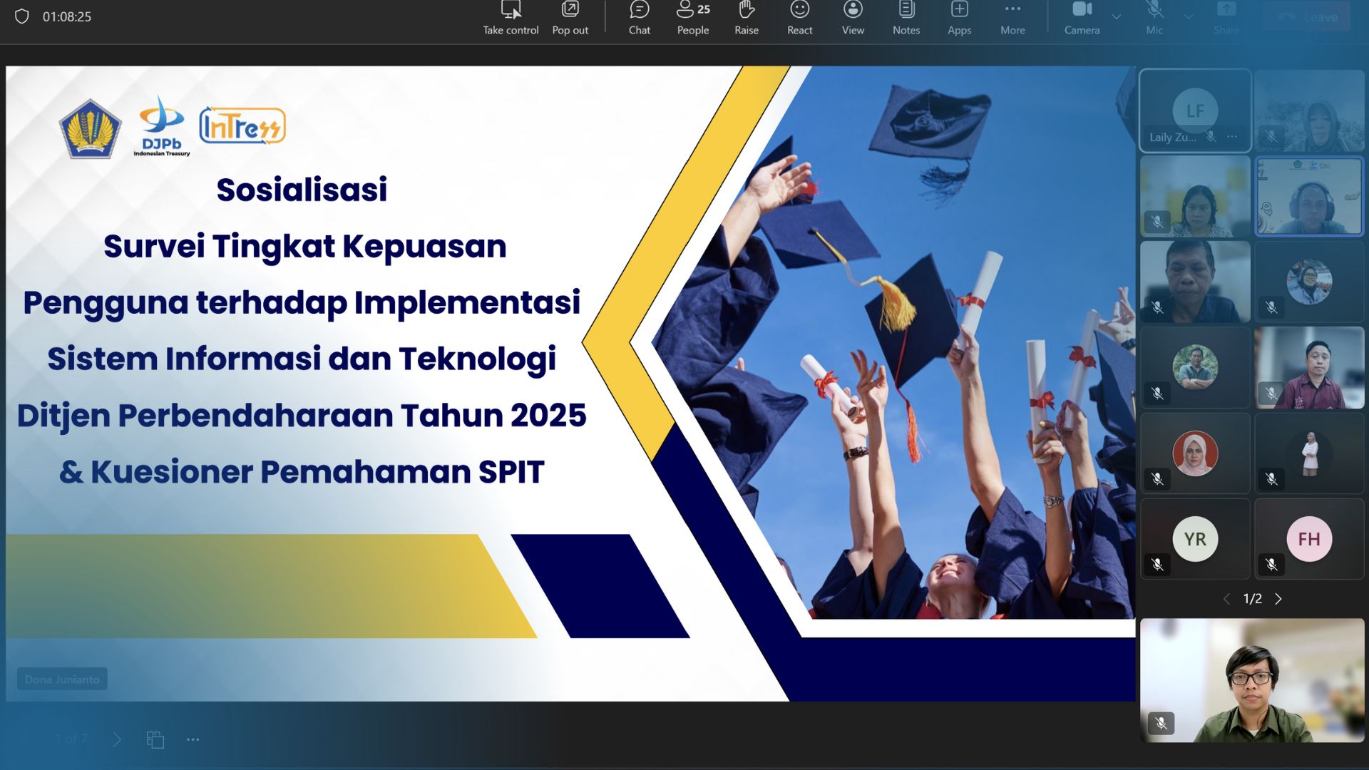 JAKARTA - Pada Selasa (23/09), KPPN Jakarta I melaksanakan rapat internal secara daring melalui aplikasi Microsoft Teams pukul 14.00–14.30 WIB. Rapat ini digelar berdasarkan Undangan Kepala KPPN Jakarta I Nomor UND-151/KP.1201/2025, dengan agenda utama sosialisasi Survei Tingkat Kepuasan Pengguna terhadap Implementasi Sistem Informasi dan Teknologi DJPb, serta sosialisasi kuesioner pemahaman Sistem Pengendalian Intern Terintegrasi (SPIT).