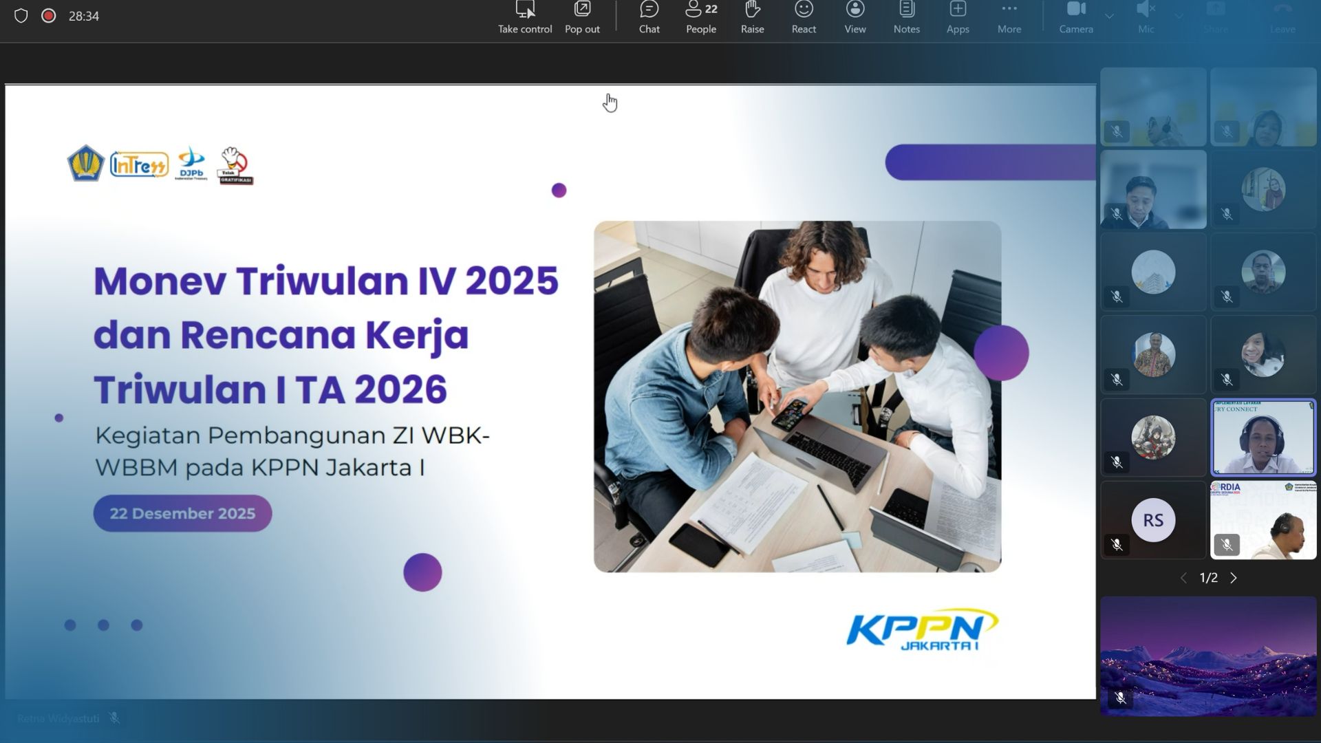 JAKARTA - KPPN Jakarta I melaksanakan Rapat Monitoring dan Evaluasi Keberlanjutan Pembangunan Zona Integritas menuju Wilayah Bebas dari Korupsi/Wilayah Birokrasi Bersih dan Melayani (WBK/WBBM) Triwulan IV Tahun 2025. Kegiatan ini dilaksanakan secara daring melalui aplikasi MS Teams pada Senin (22/12). Rapat ini dihadiri oleh Kepala KPPN Jakarta I, Jamaluddin Ambo Dai, para pejabat pengawas dan fungsional, serta seluruh pegawai KPPN Jakarta I.