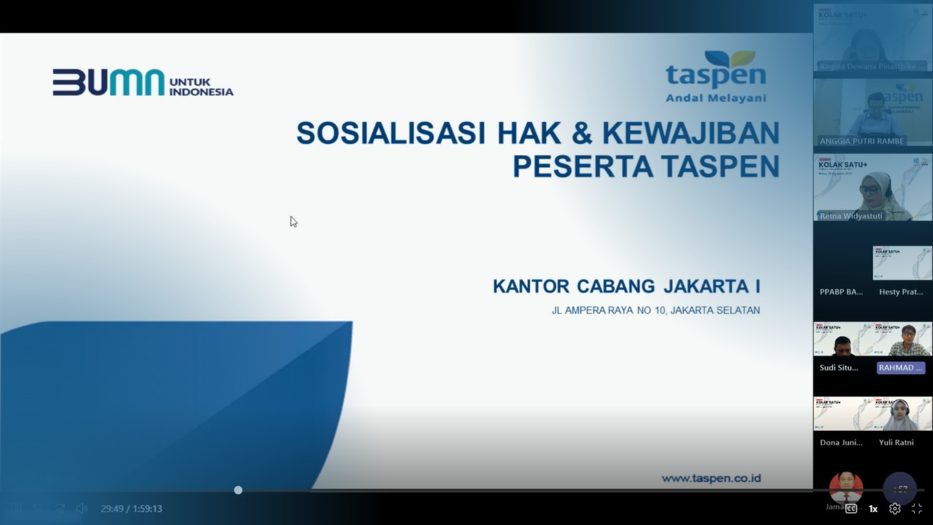 Memasuki sesi materi utama, Rahmad Hidayat dari PT Taspen Cabang Jakarta I memaparkan mengenai hak dan kewajiban peserta Taspen. Ia menjelaskan empat program utama yang dikelola, yaitu Tabungan Hari Tua (THT), Pensiun, Jaminan Kecelakaan Kerja (JKK), dan Jaminan Kematian (JKM). ASN diwajibkan membayar iuran sebesar 8% dari gaji, dengan pembagian 3,25% untuk THT dan 4,75% untuk Pensiun, sementara iuran JKK dan JKM sepenuhnya ditanggung pemerintah. Program JKK, menurut Rahmad, sangat penting karena memberikan perlindungan bagi ASN jika mengalami kecelakaan atau penyakit akibat pekerjaan, baik dalam bentuk biaya perawatan, santunan, maupun tunjangan cacat.