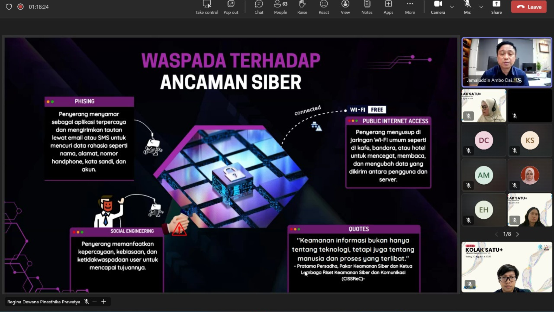 Isu keamanan siber juga menjadi sorotan. Dengan semakin luasnya digitalisasi layanan publik, risiko ancaman seperti phishing, social engineering, maupun pencurian data melalui Wi-Fi publik kian meningkat. Jamaluddin mengingatkan agar para peserta senantiasa waspada. “Keamanan informasi tidak hanya tentang teknologi, tetapi juga menyangkut manusia dan proses. Sedikit kelengahan bisa menimbulkan kerugian besar,” tegasnya.