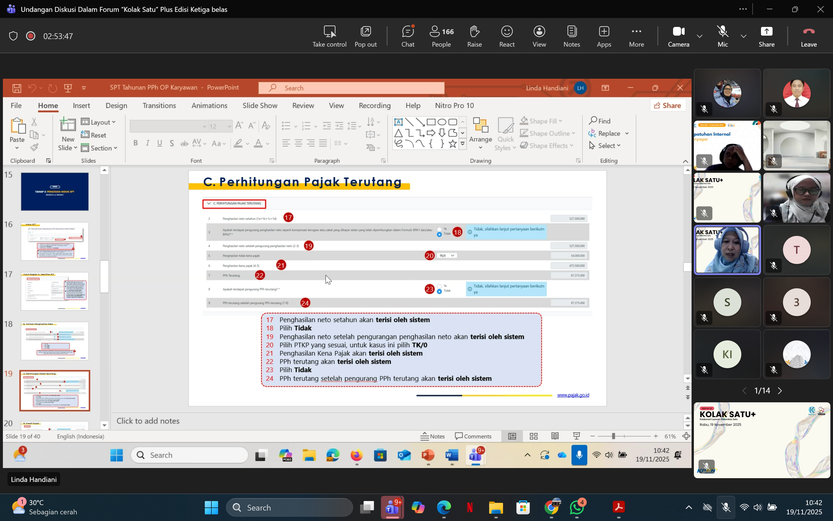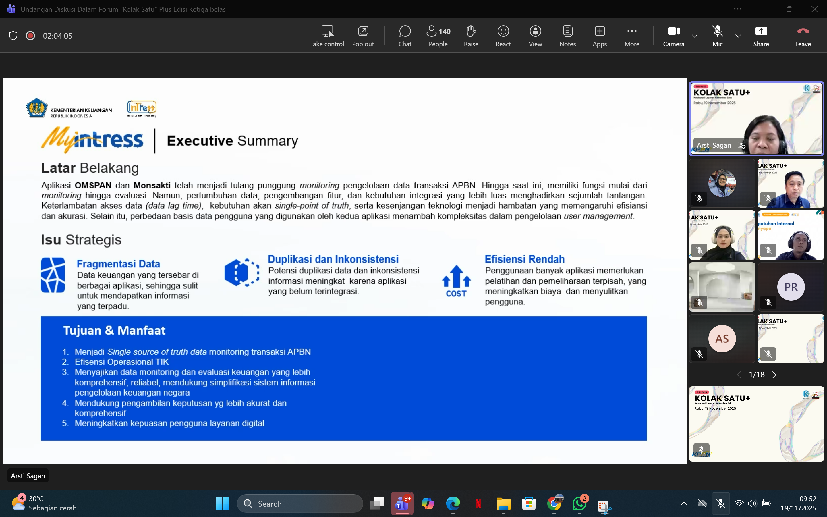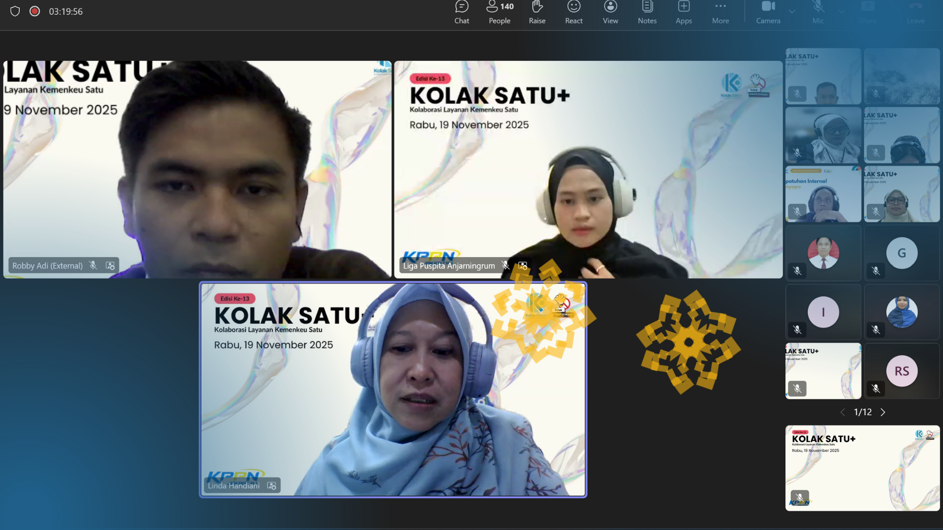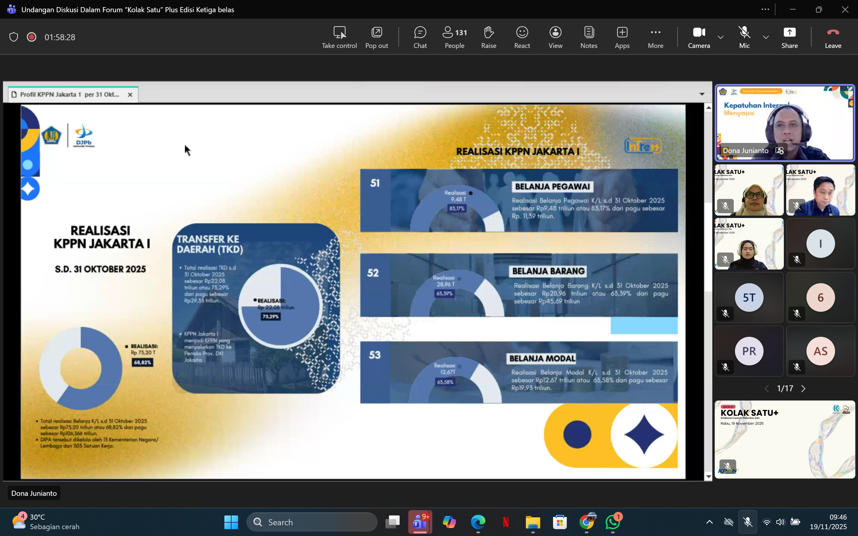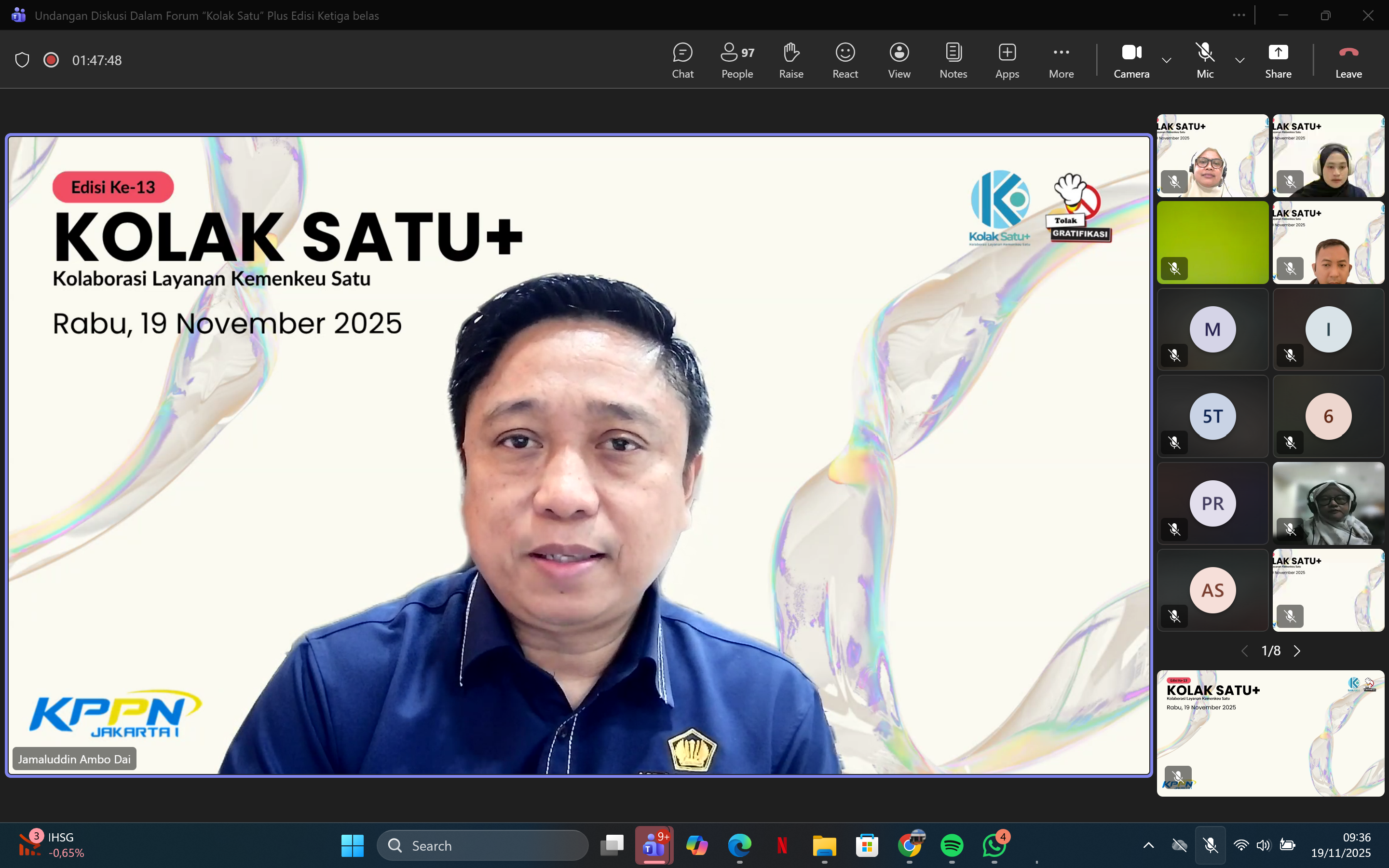 JAKARTA - KPPN Jakarta I kembali menghadirkan ruang kolaborasi lintas instansi melalui kegiatan Kolak Satu Plus (Kolaborasi Layanan Kemenkeu Satu Plus) Edisi ke-13. Agenda ini menjadi sarana strategis dalam memperkuat sinergi antara KPPN Jakarta I, KPP Pratama Jakarta Gambir Satu, dan KPKNL Jakarta II. Kegiatan diselenggarakan secara daring melalui Microsoft Teams pada Rabu, 19 November 2025. Seluruh peserta dari berbagai satuan kerja hadir untuk mendapatkan pembaruan informasi dan peningkatan kompetensi.