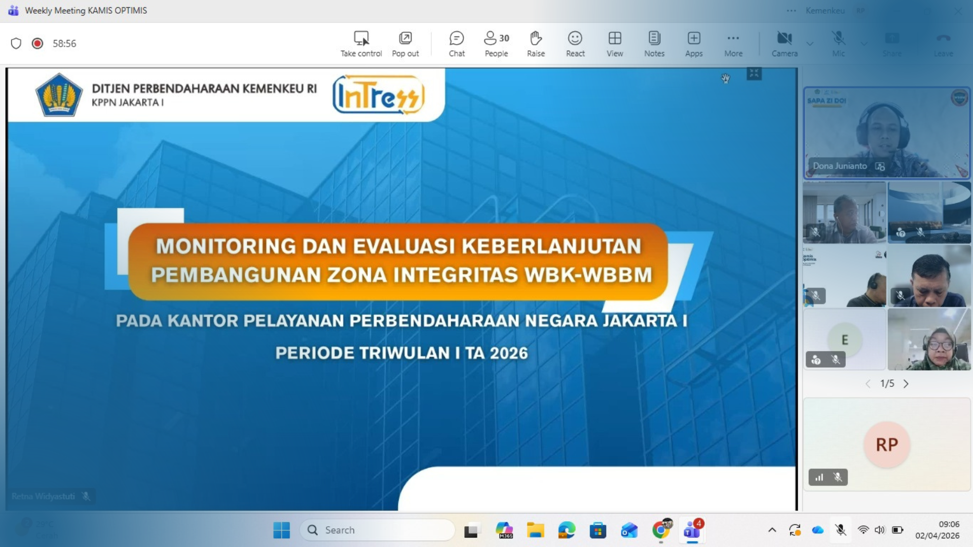 JAKARTA - Semangat membangun birokrasi yang bersih dan melayani terus digaungkan di lingkungan KPPN Jakarta I. Melalui kegiatan Monitoring dan Evaluasi (Monev) Pembangunan Zona Integritas (ZI) menuju WBK-WBBM Triwulan I Tahun 2026, seluruh jajaran kembali menyatukan langkah untuk memastikan bahwa integritas bukan sekadar slogan, melainkan budaya kerja yang hidup dan dirasakan. Kegiatan yang dilaksanakan secara daring melalui Microsoft Teams pada Kamis (2/4) ini menjadi bagian dari agenda rutin “Kamis Optimis”—sebuah kanal monitoring sekaligus ruang refleksi bagi seluruh pegawai dalam mengawal misi strategis organisasi.