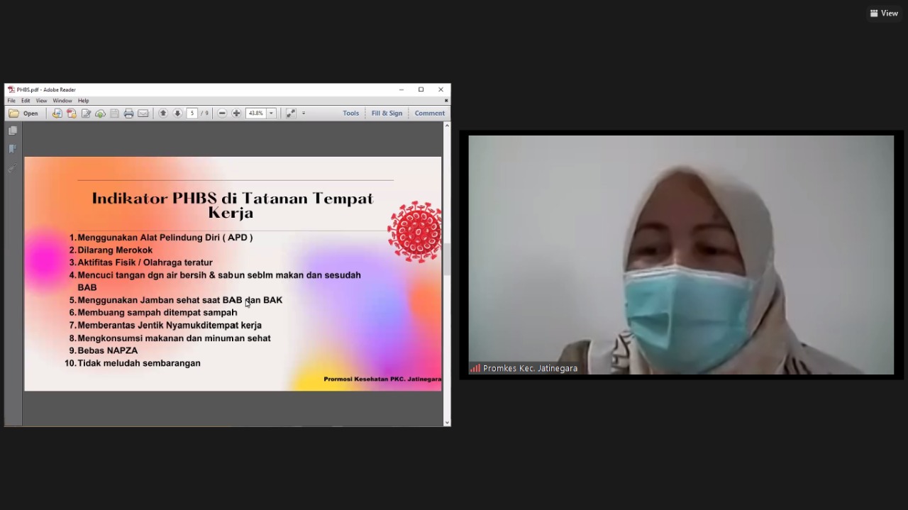 Pada Webinar tersebut, Ririn Yuliana yang merupakan Penanggung Jawab promosi kesehatan di Puskesmas Jatinegara, menyampaikan materi terkait Perilaku Hidup Bersih dan Sehat (PHBS) di tatanan Tempat Kerja. Perilaku Hidup Bersih dan Sehat di tatanan Tempat Kerja sangat diperlukan karena Perkantoran menjadi salah satu dari 5 target penerapan PHBS sesuai KMK No. HK.01.07/mankes/328/2020 tentang Panduan Pencegahan dan Pengendalian Corona Virus Disease (Covid-19) di tempat kerja perkantoran dan industri dalam mendukung keberlangsungan usaha pada situasi pandemi.