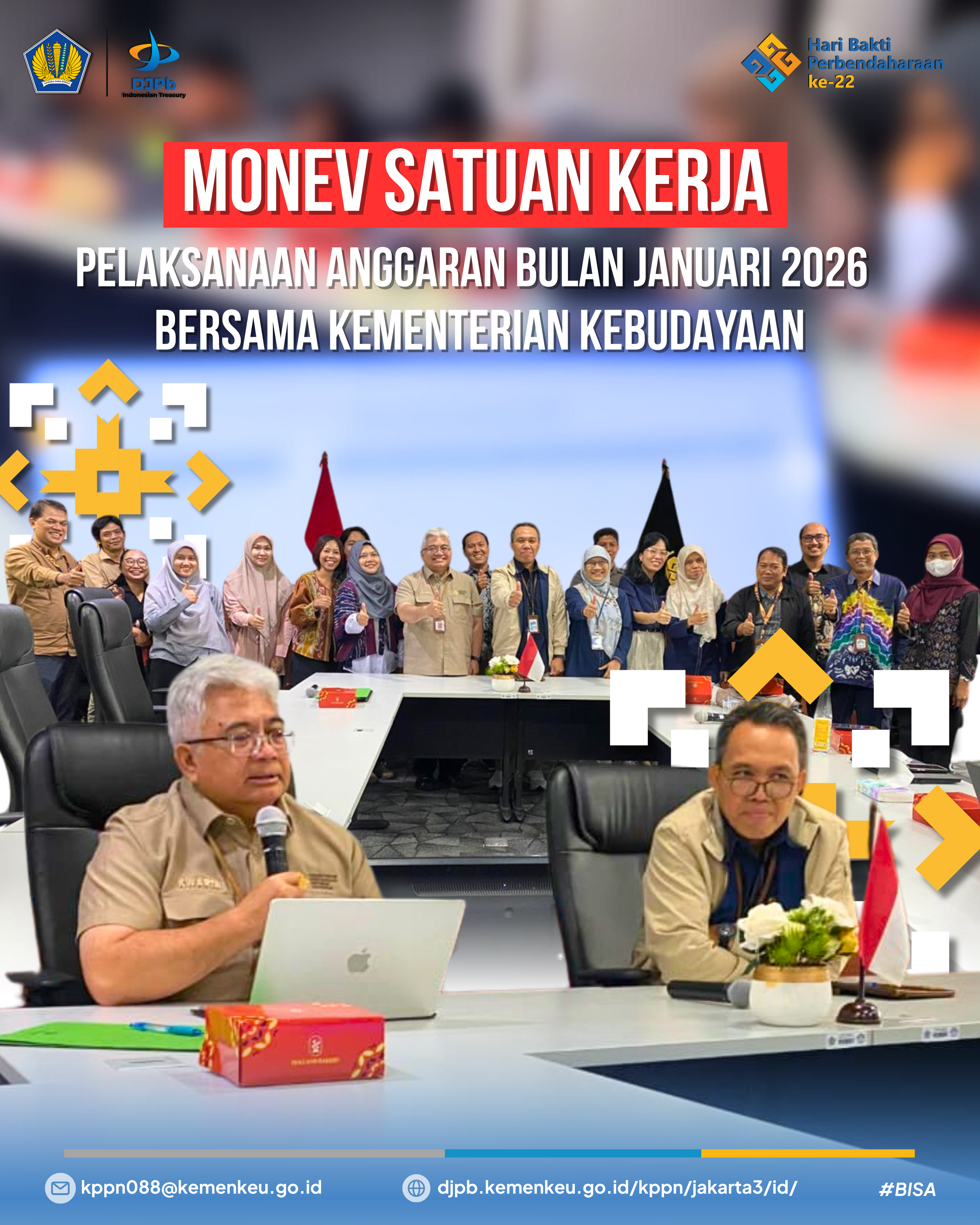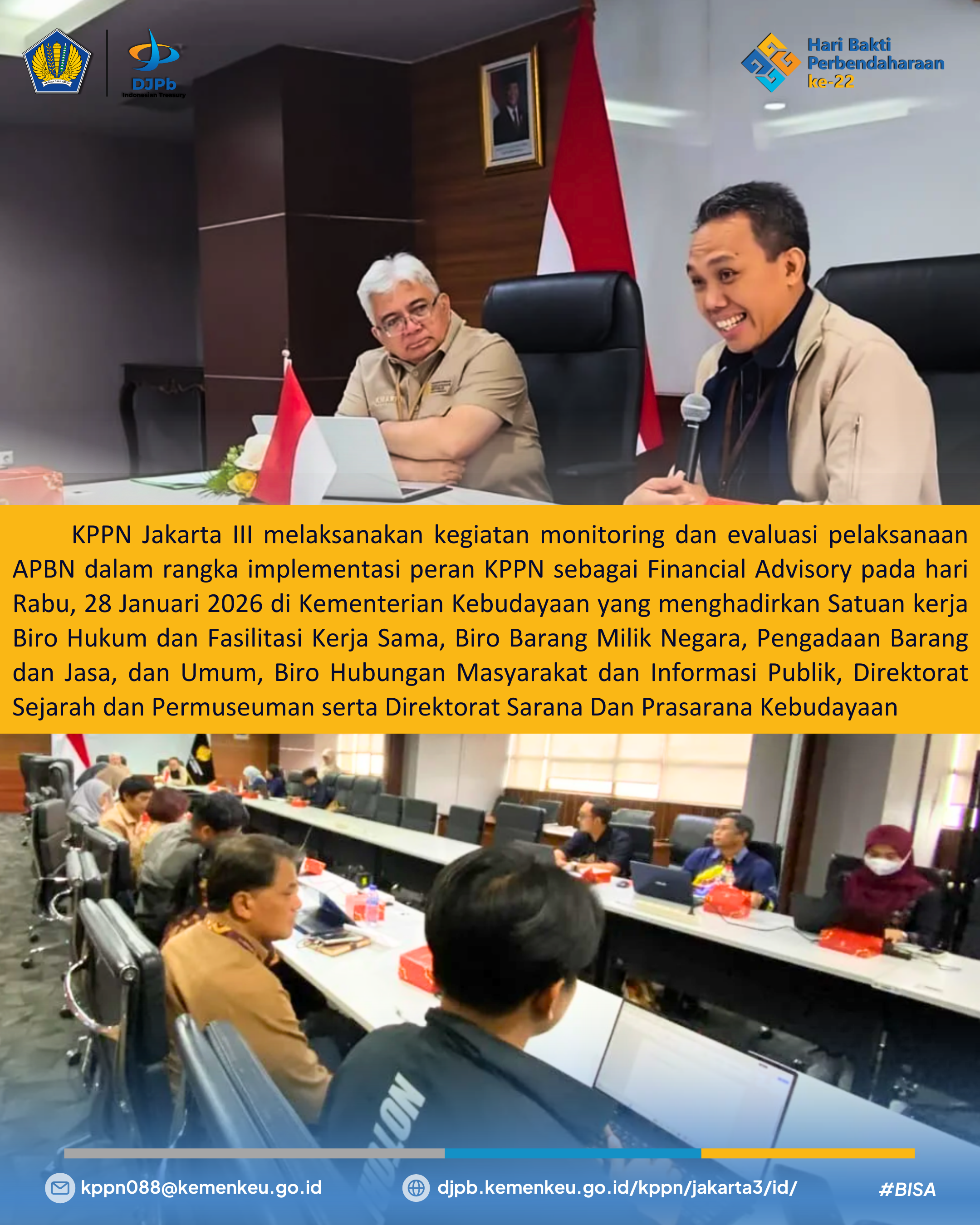 KPPN Jakarta III melaksanakan kegiatan monitoring dan evaluasi pelaksanaan APBN dalam rangka implementasi peran KPPN sebagai Financial Advisory pada hari Rabu, 28 Januari 2026 di Kementerian Kebudayaan yang menghadirkan Satuan kerja Biro Hukum dan Fasilitasi Kerja Sama, Biro Barang Milik Negara, Pengadaan Barang dan Jasa, dan Umum, Biro Hubungan Masyarakat dan Informasi Publik, Direktorat Sejarah dan Permuseuman serta Direktorat Sarana Dan Prasarana Kebudayaan.
