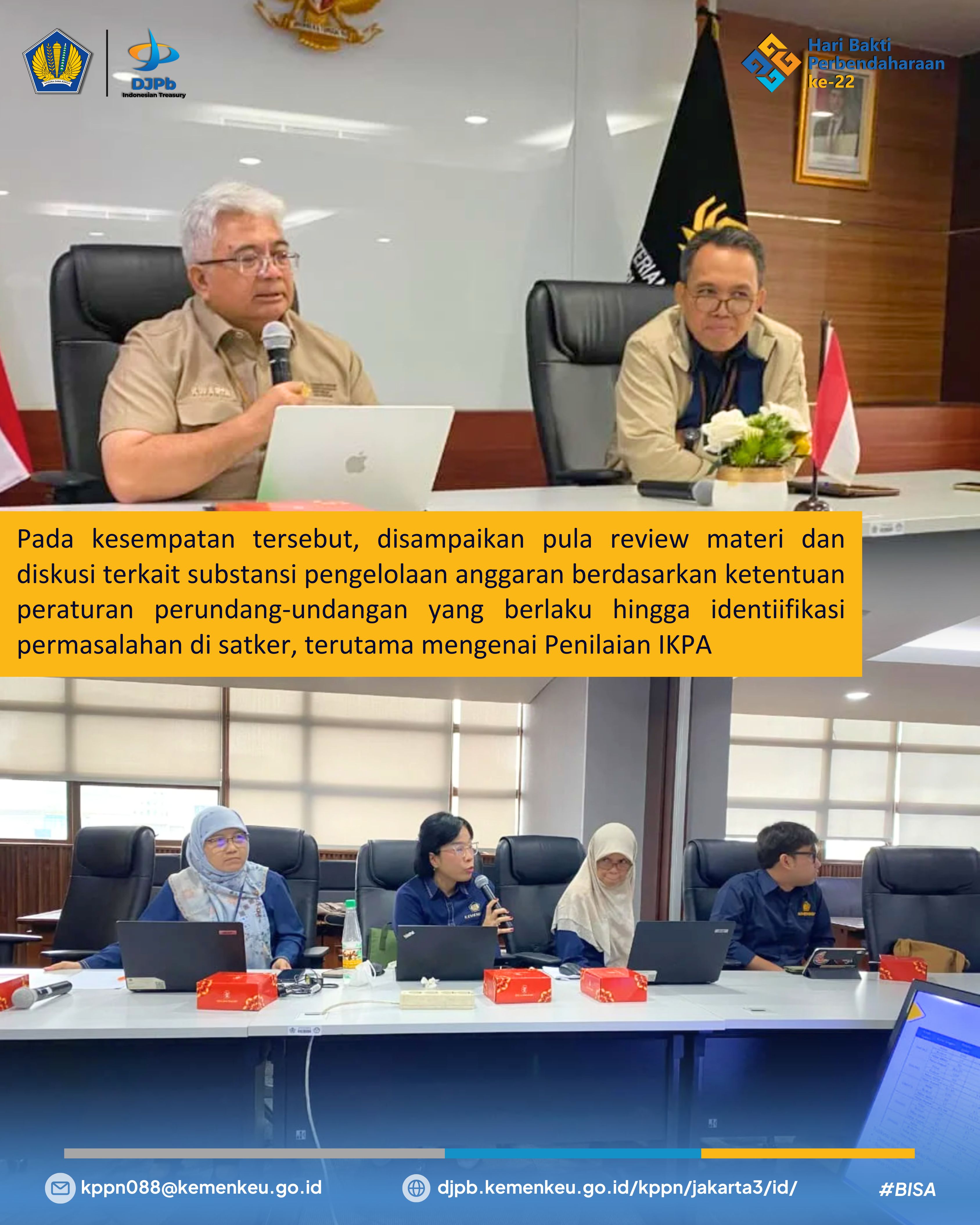 Pada kesempatan tersebut, disampaikan pula review materi dan diskusi terkait substansi pengelolaan anggaran berdasarkan ketentuan peraturan perundang-undangan yang berlaku hingga identiifikasi permasalahan di satker, terutama mengenai Penilaian IKPA