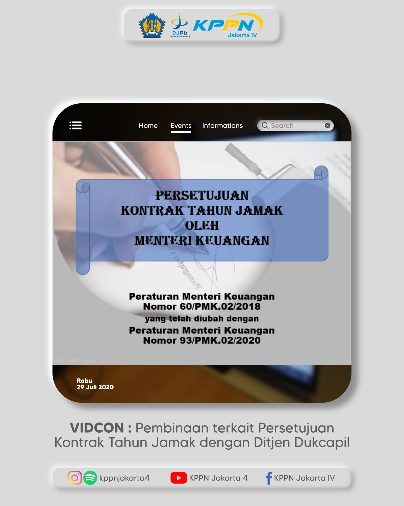 Dengan adanya PMK Nomor 93/PMK.02/2020 tentang Perubahan Atas PMK Nomor 60/PMK.02/2018 tentang Persetujuan Kontrak Tahun Jamak Oleh Menteri Keuangan, KPPN Jakarta IV melakukan pembinaan kepada satker mitra kerjanya untuk meningkatkan akuntabilitas pengelolaan anggaran. Pada kesempatan kali ini, mitra yang berkesempatan untuk mendapat pembinaan adalah Direktorat Jenderal Kependudukan dan Pencatatan Sipil Kementerian Dalam Negeri (Ditjen Dukcapil Kemendagri).