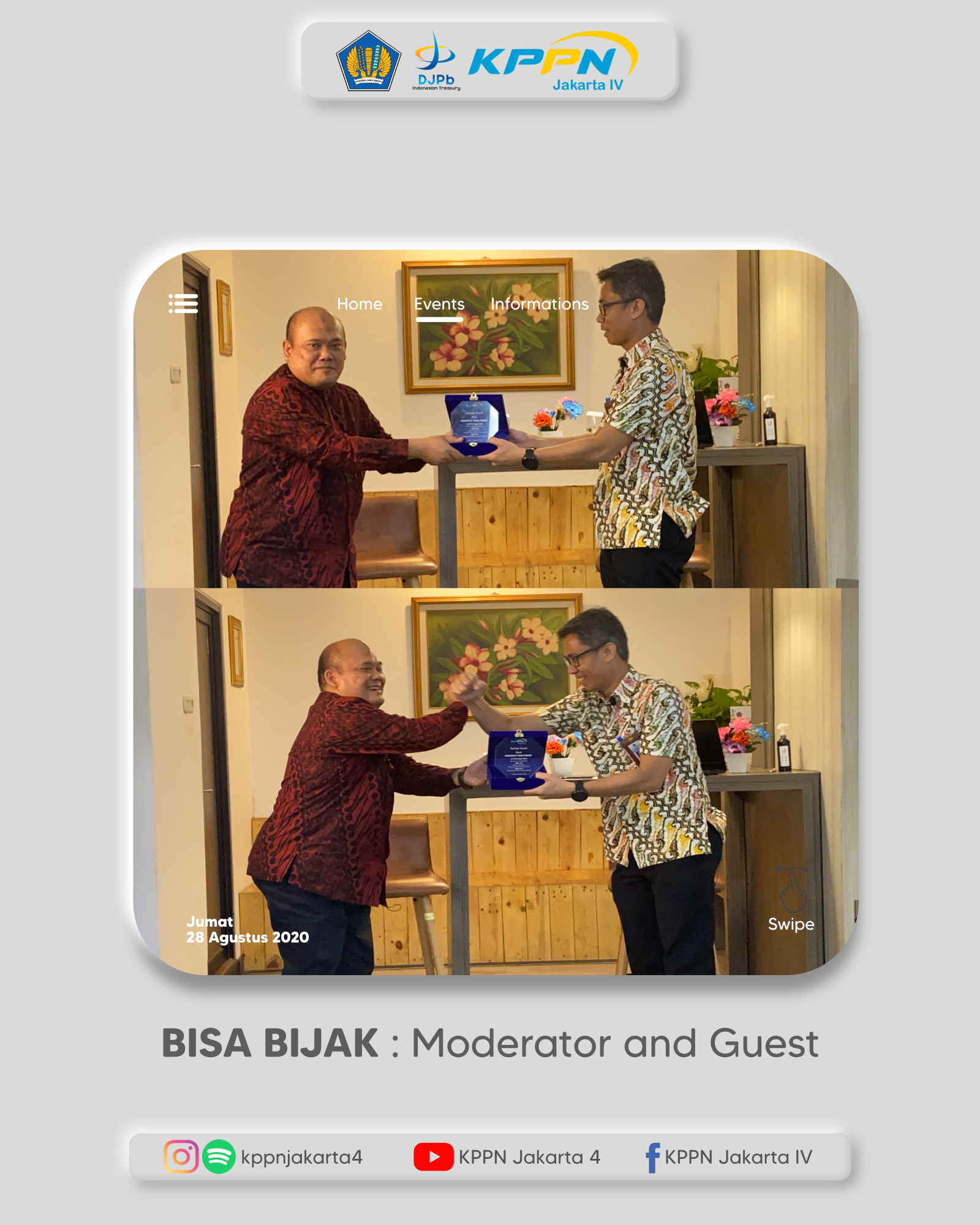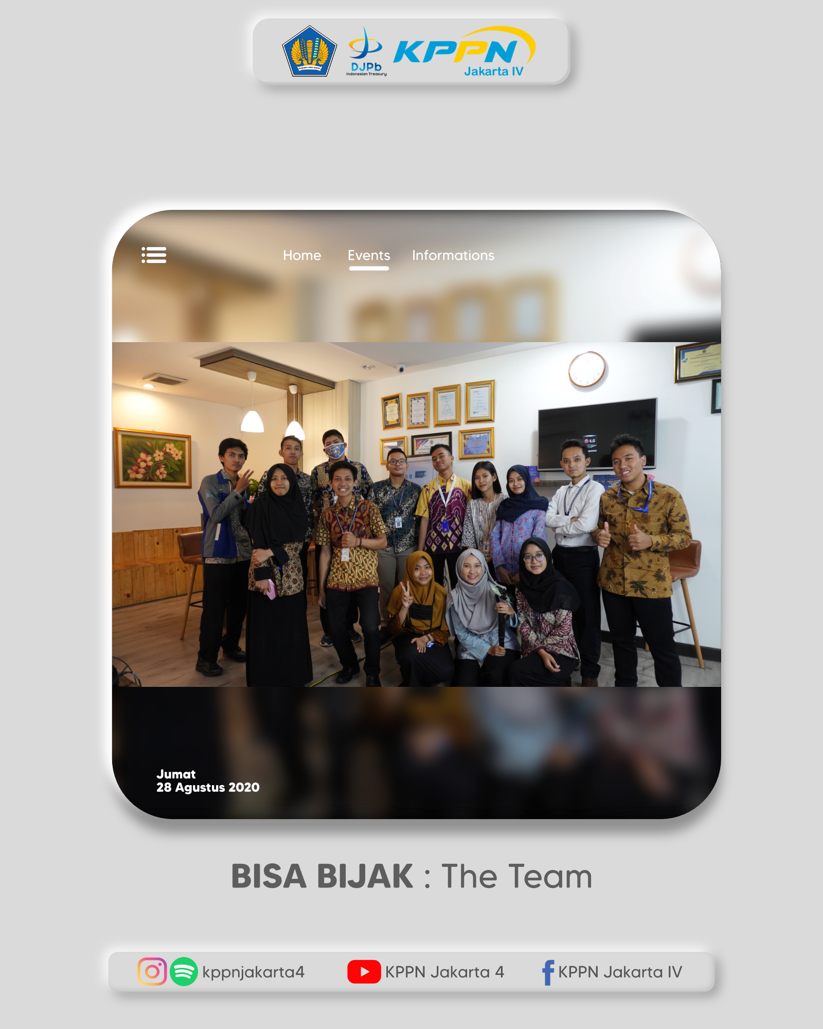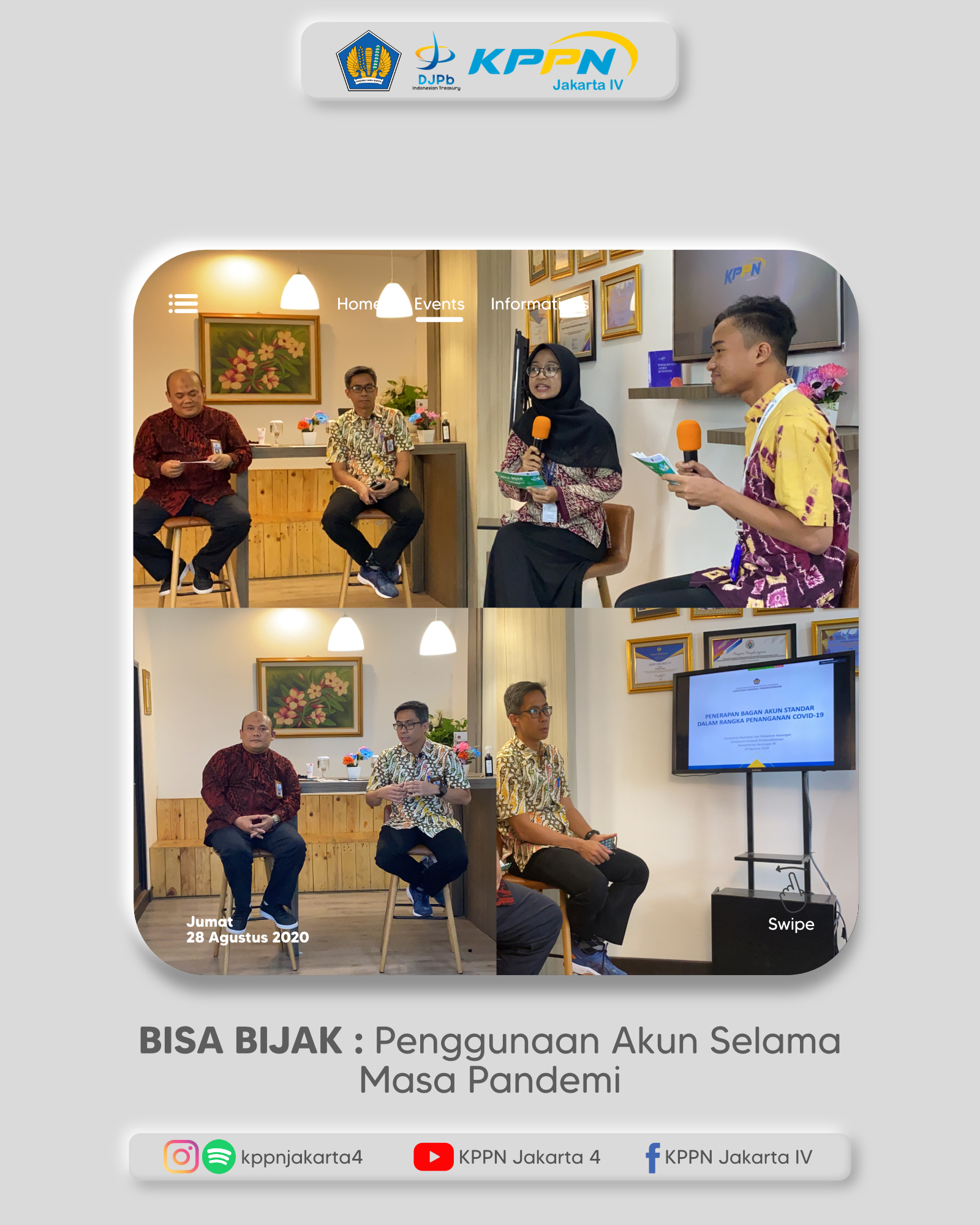 Terima kasih kepada satker mitra kerja KPPN Jakarta IV yang telah menonton tayangan langsung BISA BIJAK melalui platform Youtube . Terima kasih juga kepada tim dibalik suksesnya acara BISA BIJAK beserta grup band yang telah menampilkan penampilan paling seru dari rekan-rekan pegawai OJT KPPN Jakarta IV “D’Prambanan”.