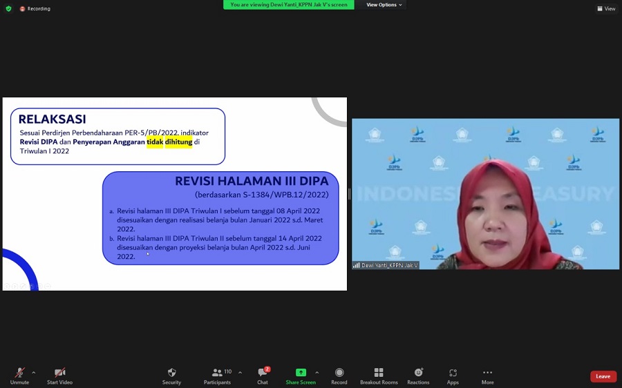 Dalam arahannya, Ibu Dewi Yanti selaku Kepala KPPN Jakarta V menyampaikan perlunya koordinasi lebih lanjut antara KPPN Jakarta V dengan Satuan Kerja Mitra untuk mendalami kendala dengan cara duduk bersama untuk membahas bagaimana strategi efektif yang dapat dilakukan satuan kerja menimbang karakteristik khusus masing masing satuan kerja yang berbeda antara satu sama lain. Salah satu komponen dalam penilaian Kinerja Pelaksanaan Anggaran adalah Penyerapan Anggaran, Masih rendahnya penyerapan Anggaran sampai dengan mendekati Triwulan II tahun 2022 ini, sehingga diperlukan sinergi bersama antara satuan kerja dengan KPPN. Tidak lupa beliau mengingatkan bahwa Penyerapan Anggaran yang dilakukan Satuan kerja mempunyai multiplier effect dalam mendorong pemulihan Ekonomi Nasional sesuai dengan fungsi APBN.