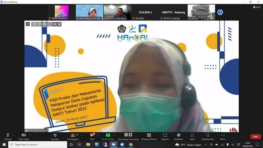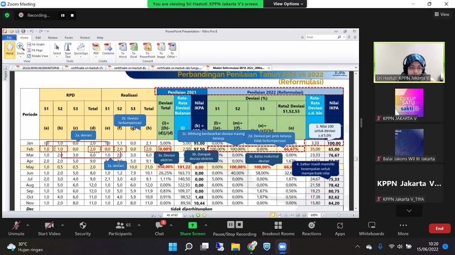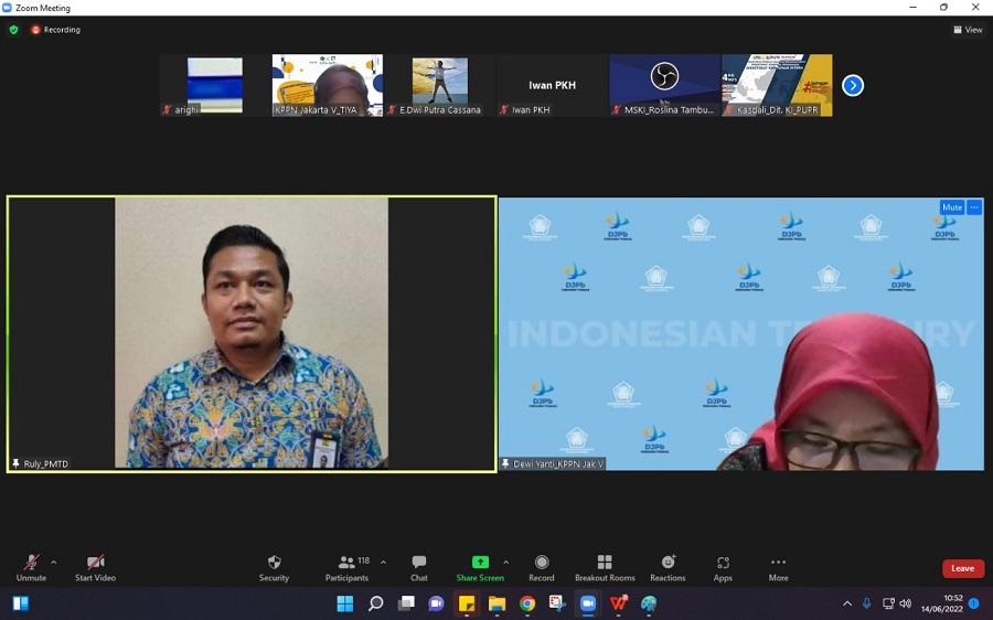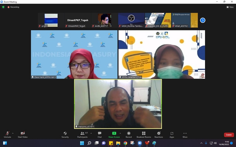 Penyerapan anggaran merupakan salah satu komponen penting dalam penilaian Kinerja Pelaksanaan Anggaran. Komponen penyerapan anggaran merupakan salah satu concern utama KPPN Jakarta V kepada Satuan Kerja mitra kerjanya. Hal inilah yang mendorong KPPN Jakarta V mengadakan kegiatan 1 On 1 Meeting dengan Satuan Kerja Lingkup KPPN Jakarta V selama 3 hari mulai dari Selasa, 14 Juni 2022 sampai dengan Kamis, 16 Juni 2022. Kegiatan ini merupakan salah satu upaya KPPN Jakarta V untuk meningkatkan sekaligus mendorong Satuan Kerja dalam menyamakan persepsi tentang Perdirjen Perbendaharaan Nomor PER-5/PB/2022 tentang Petunjuk Teknis Penilaian Indikator Kinerja Pelaksanaan Anggaran Belanja Kementerian Negara/Lembaga. Acara ini diselenggarakan secara on-line dimana Satuan Kerja mengikuti dari tempat masing-masing.