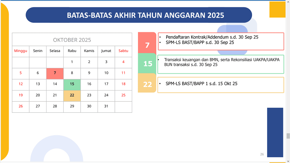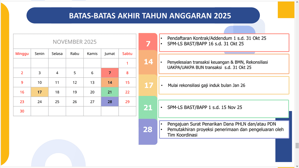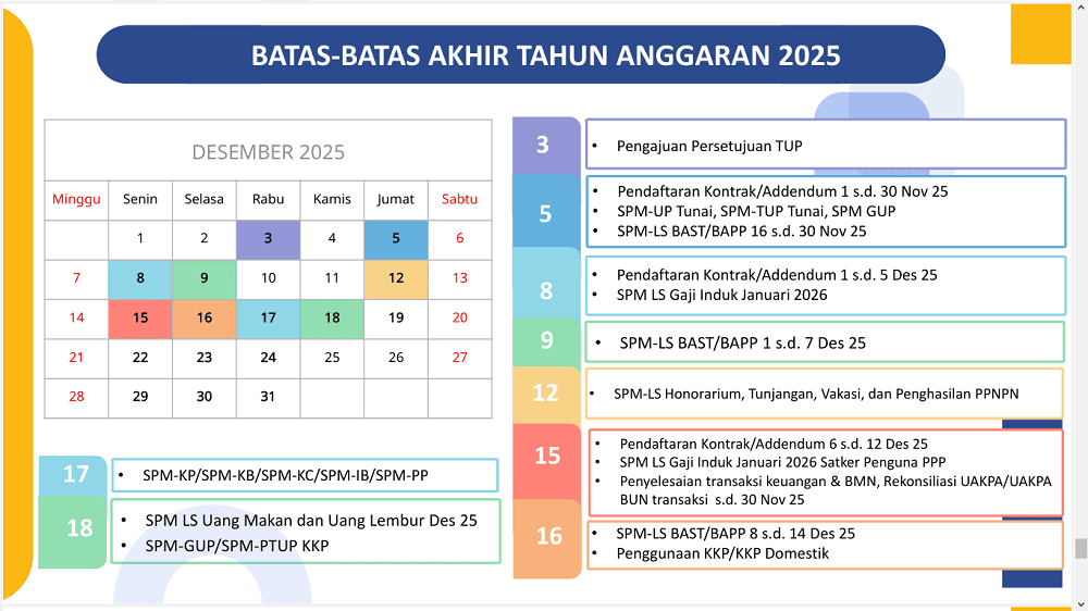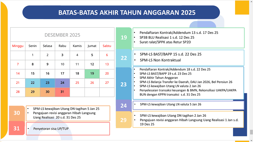 Berikut adalah materi kegiatan Sosialisasi LLAT 2025 dan kalender batas-batas akhir tahun anggaran 2025 sesuai dengan Peraturan Direktur Jenderal Perbendaharaan nomor PER-17/PB/2025 tentang Langkah-langkah dalam Menghadapi Akhir Tahun Anggaran 2025: