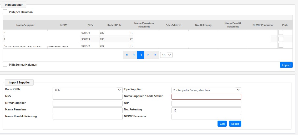 Adapun data supplier yang di daftarkan meliputi (1) informasi pokok (header supplier) berupa data NPWP, NRS,nama supplier, (2) informasi lokasi (supplier addres) meliputi nama site, kode negara, kode KPPN, alamat, kota, provinsi, kode pos, dan kode tipe dan (3) Informasi Rekening (Data Bank) meliputi kode negara asal bank, kode bank, nama bank, kode SWIFT dan/atau IBAN, nama cabang bank, nama pemilik rekening, dan nomor rekening.