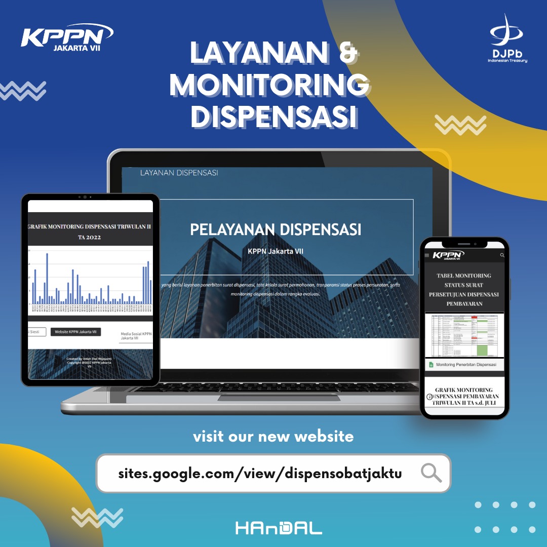 KPPN Jakarta VII menghadirkan situs baru berbasis google yang berisi seputar layanan dan monitoring dispensasi mitra satuan kerja. Sobat Jaktu dapat memantau status surat dan menggunakan format surat permohonan yang tersedia. Ayo cek sekarang juga!
