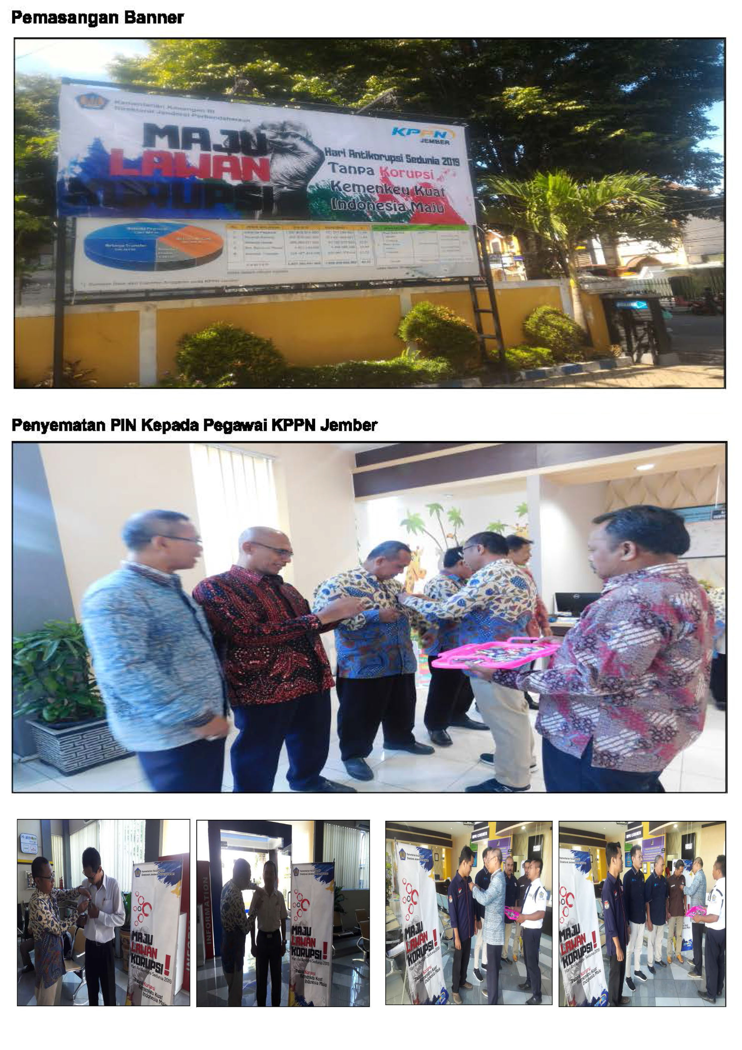 Pada saat Morning Call Hari Selasa Tanggal 10 Desember 2019 telh dilakukan Penyematan PIN kepada seluruh pegawai dan Mitra Kerja KPPN Jember. Pemasangan Banner Anti Korupsi dengan tema "Maju Lawan Korupsi" dilakukan sebagai sarana komunikasi kepada Mitra Kerja KPPN Jember agar tidak ragu untuk bersama-sama melawan korupsi, dan sebagai pesan bahwa pelayanan yang diberikan kepada mitra kerja oleh KPPN Jember "Zero Cost. Mitra kerja KPPN Jember tersebut di pilih secara acak, yaitu pada saat Satuan Kerja (Satker) datang ke KPPN Jember dan dilayani oleh petugas Front Office (FO), penyematan PIN Anti Korupsi dilakukan oleh Kepala Kantor (Arif Khuzaini) dan Kepala Seksi MSKI (Owi Asto Sutoso)