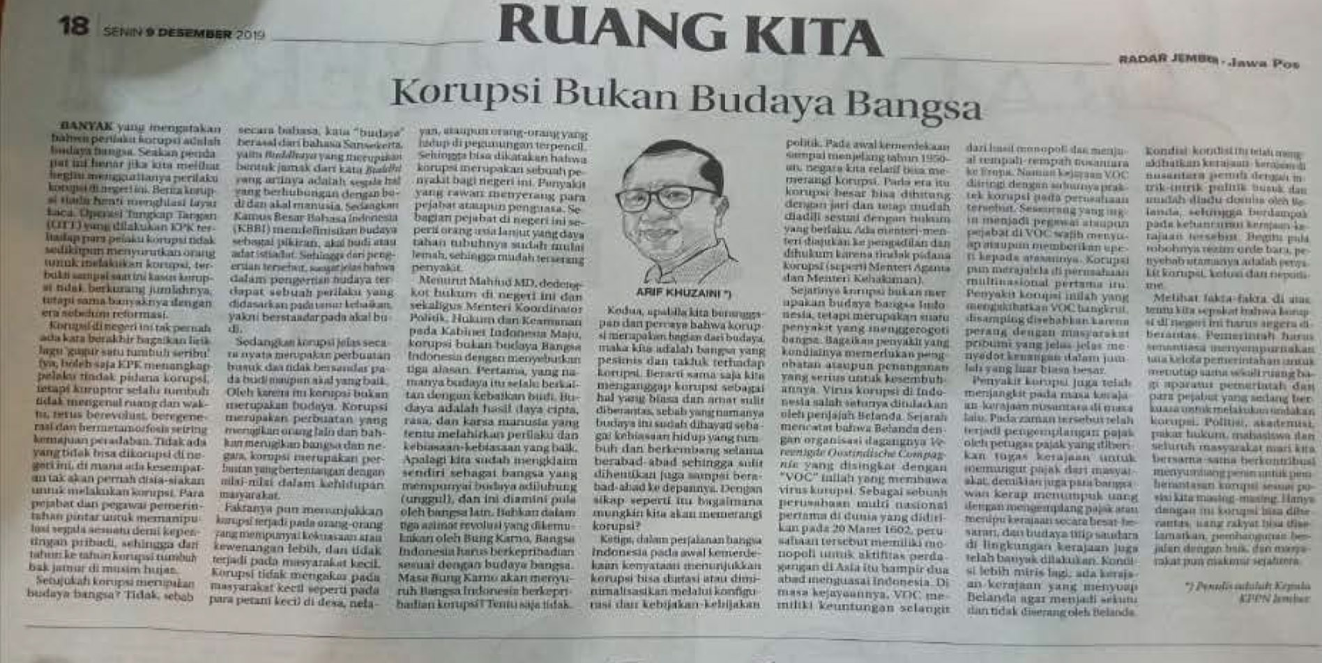 Kepala Kantor Pelayanan Perbendaharaan Negara Jember ikut berpartisipasi dengan menulis artikel yang bertemakan anti korupsi dengan mengambil judul "Korupsl Bukan Budaya Bangsa" yang dimuat di media massa Radar Jember pada tanggal 9 Desember 2019, dimana Kepala Kantor menyampaikan dalam artikelnya "Sejatinya Korupsi bukan merupakan budaya bangsa indonesia, tetapi merupakan suatu penyakit yang menggerogoti bangsa. Bagaikan penyakit yang kondisinya memerlukan pengobatan ataupun penanganan yang serius untuk kesembuhannya. Virus korupsi di indonesia salah satunya ditularkan oleh penjajah Belanda"