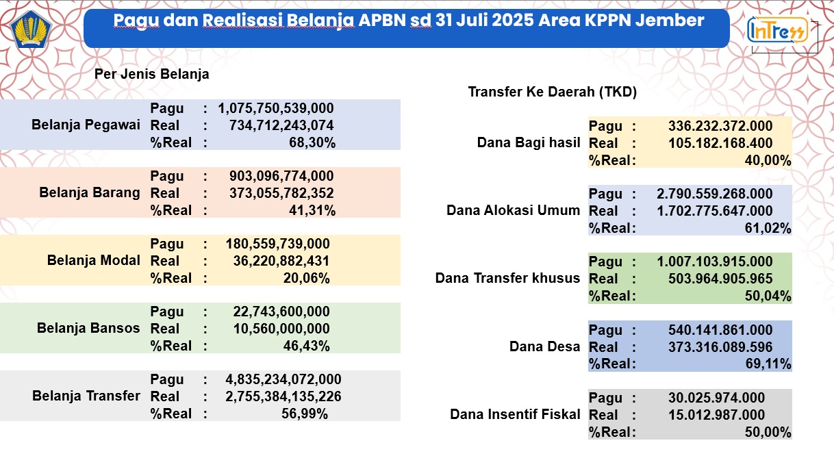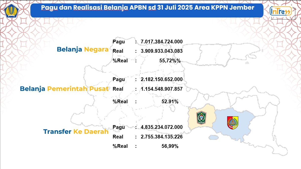 Sampai dengan tanggal 31 Juli 2025 tercatat belanja negara yang direalisasikan melalui KPPN Jember total senilai Rp. 3.909,93 miliar dari pagu Rp. 7.017,38 miliar atau sebesar 55,72%. Dari sejumlah Rp. 3.909,93 miliar tersebut terdiri dari realisasi Belanja Pemerintah Pusat sebesar Rp. 1.154,54 miliar dari pagu Rp. 2.182,15 miliar (52,91%) dan realisasi Transfer ke Daerah sebesar 2.755,38 miliar dari pagu Rp. 4.835,23 miliar (58,99%).