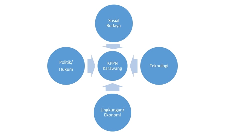 Strategi organisasi STEP (Sociocultural, Technological, Environmental/Economic, and Political/Legal) adalah metode untuk menganalisis lingkungan eksternal yang memengaruhi kinerja organisasi. Analisis ini membantu organisasi memahami faktor-faktor yang dapat menciptakan peluang atau ancaman, sehingga dapat merumuskan strategi yang lebih efekti. KPPN Karawang harus mampu untuk mengidentifikasi isu eksternal yang mempengaruhi kinerja organisasi atau bahkan keberlangsungan organisasi. Isu tersebut dapat berasal dari faktor politik/hukum, teknologi, lingkungan atau ekonomi serta sosial budaya.