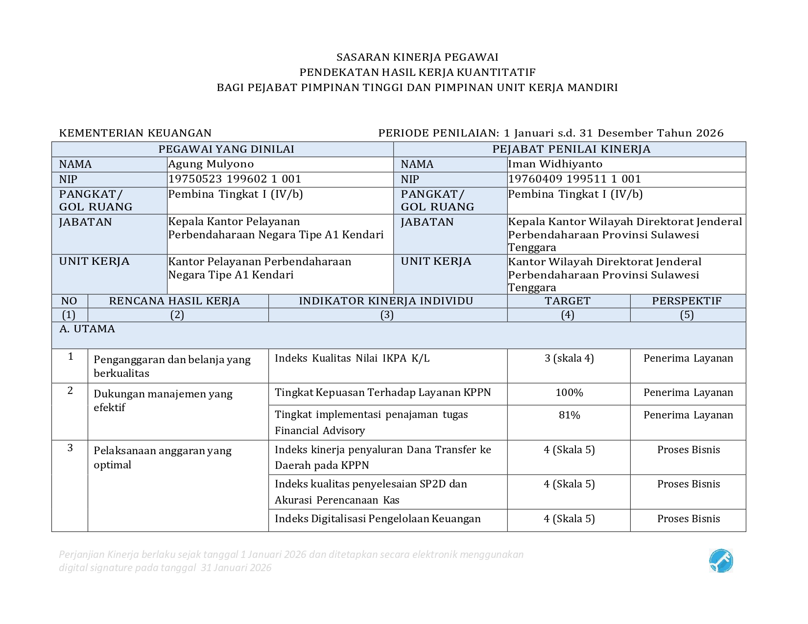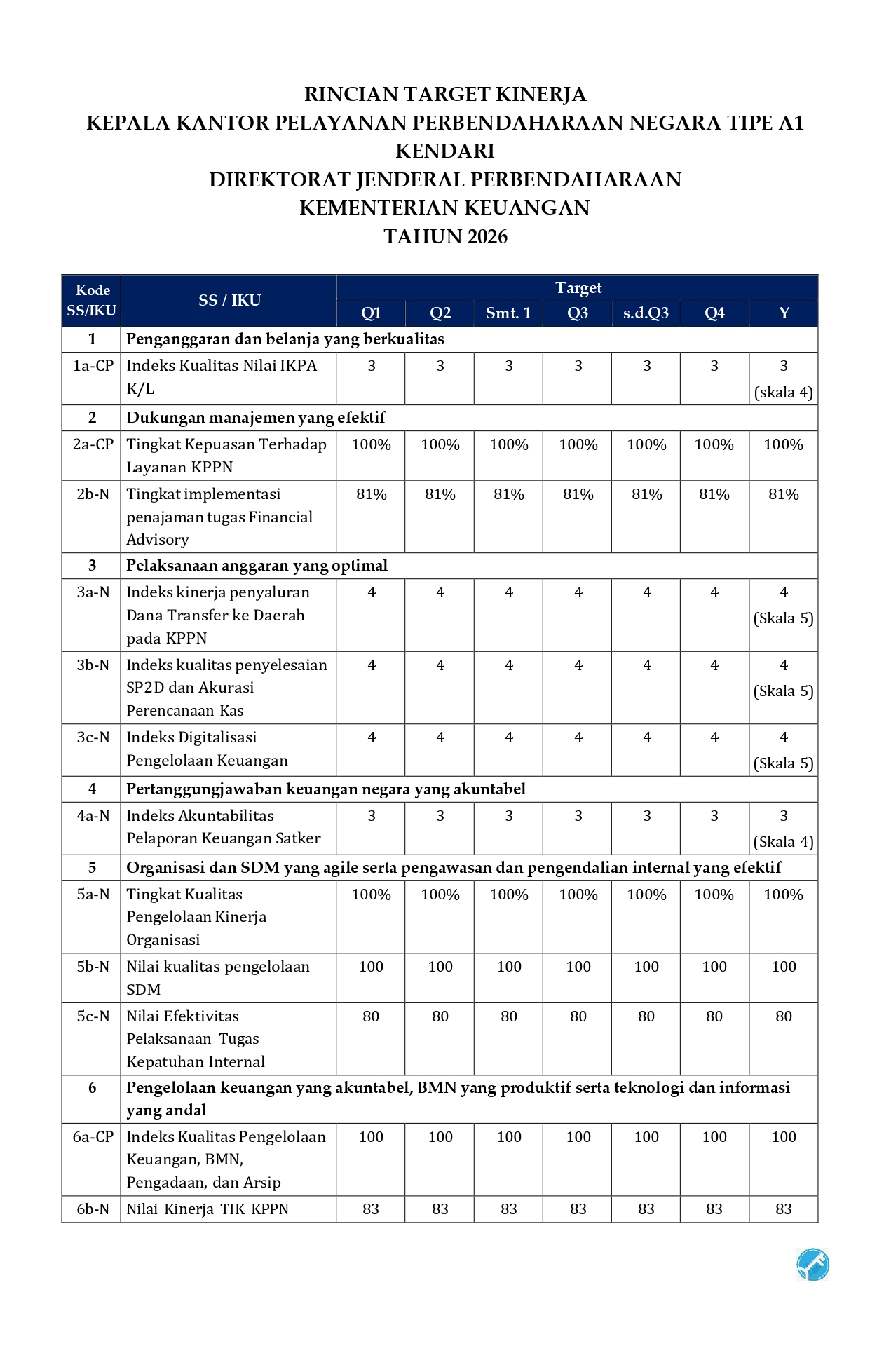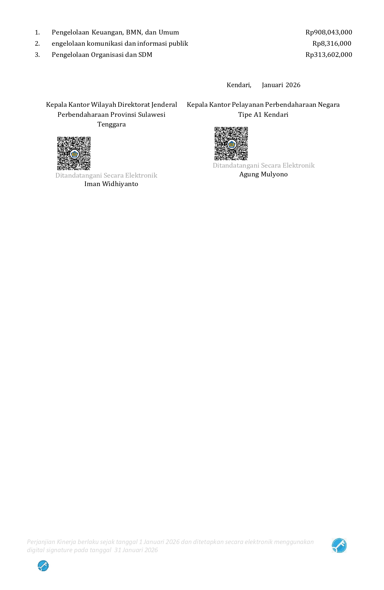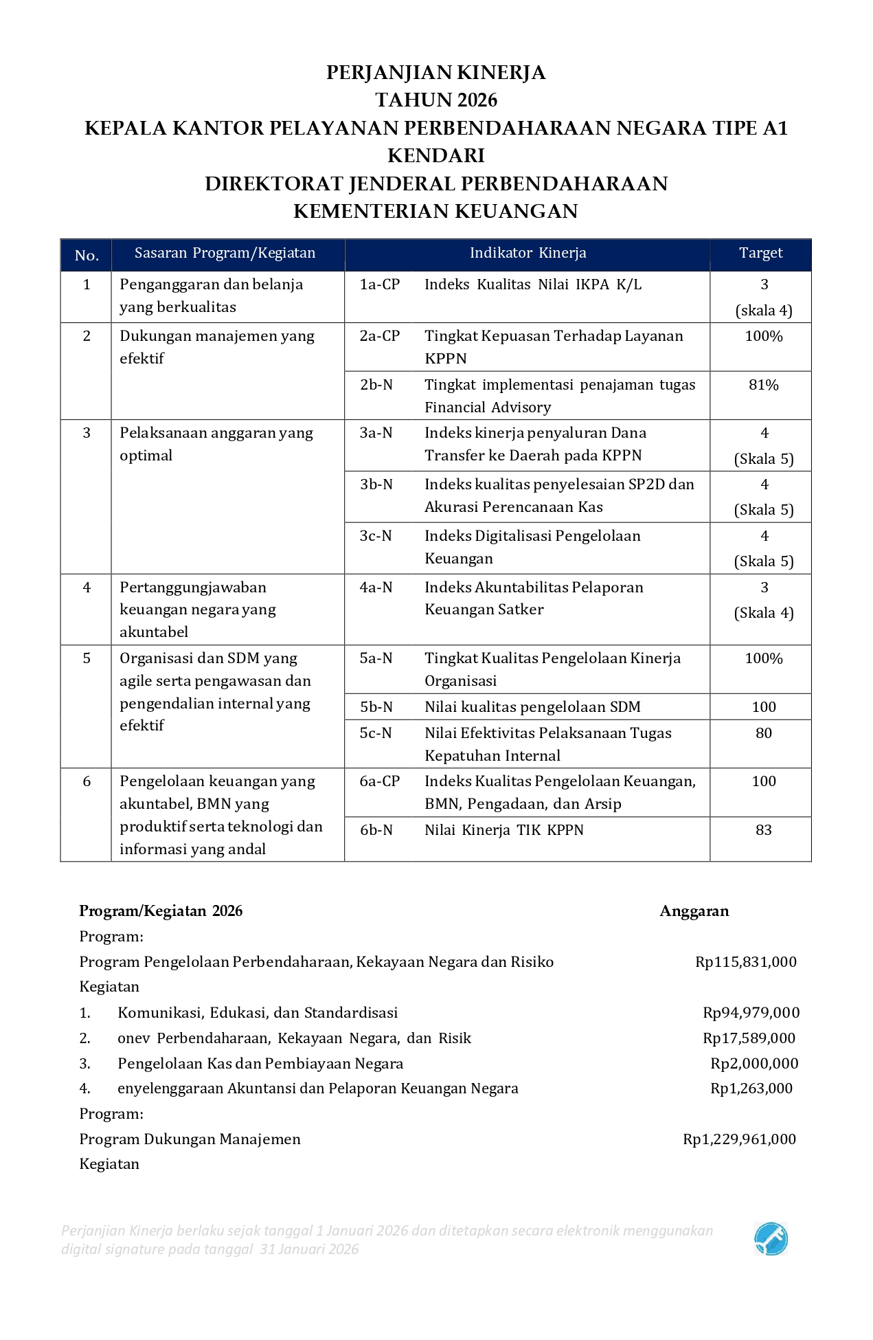 Berikut adalah Dokumen Perjanjian Kinerja KPPN Kendari Tahun 2026: