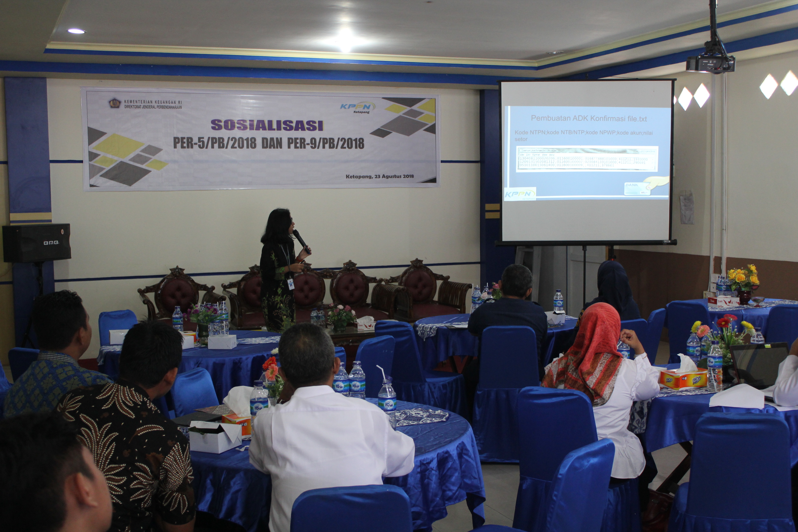 Pada hari Kamis, 23 Agustus 2018 bertempat di Aula KPPN Ketapang, diselenggarakan acara Sosialisasi Peraturan PER-5 dan PER-9/PB/2018. Pada pukul 09.00, Adi Setiawan selaku Kepala KPPN Ketapang membuka acara Sosialisasi. Sosialisasi mengenai Konfirmasi Penerimaan Negara dan juga Retur SP2D ini, yang merupakan layanan seksi Bank di KPPN juga erat kaitannya dengan pihak perbankan. Setelah dibuka oleh Kepala KPPN Ketapang, sosialisasi diisi oleh Indria Kristiani, pelaksana Seksi Bank KPPN Ketapang.