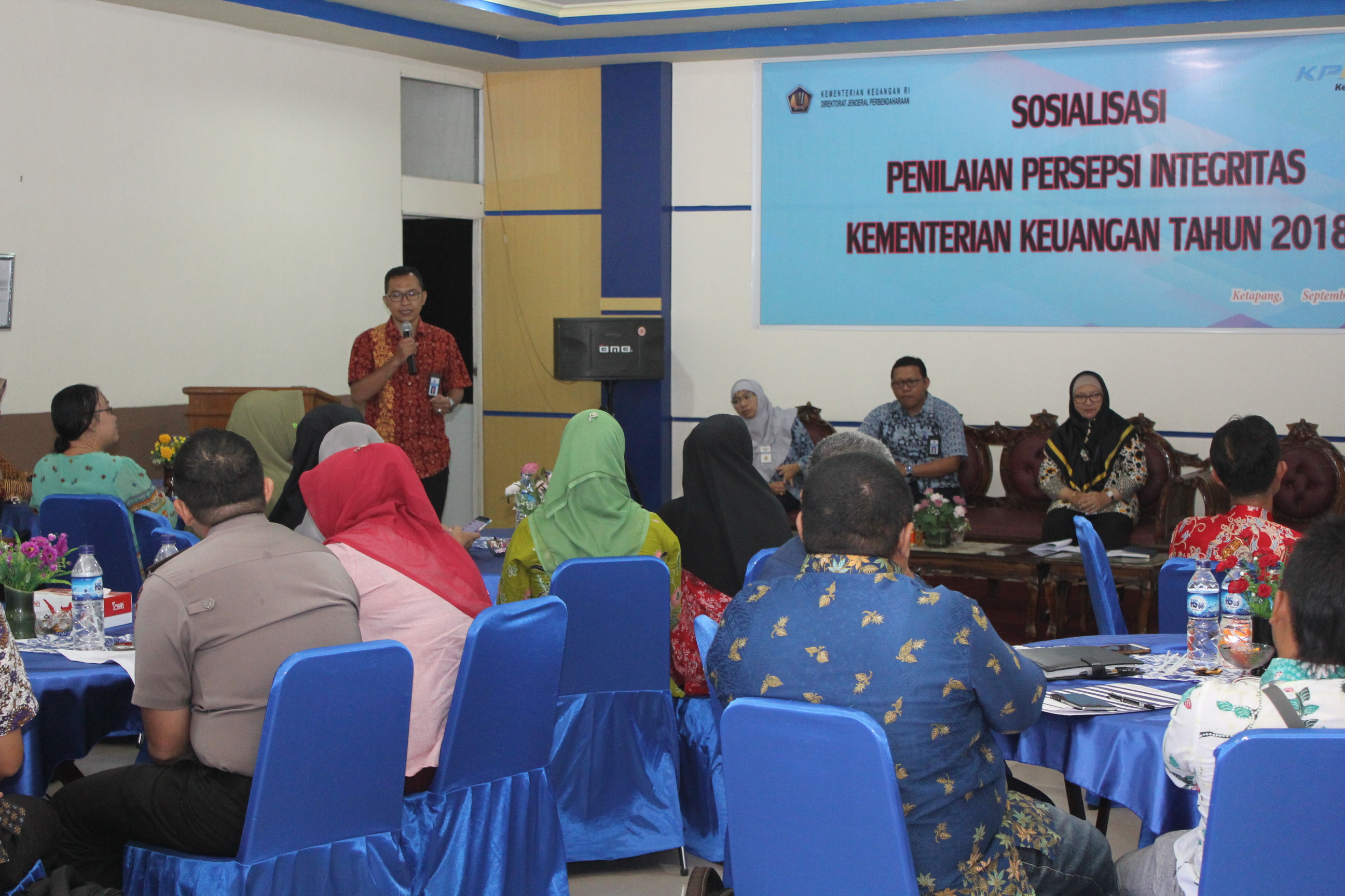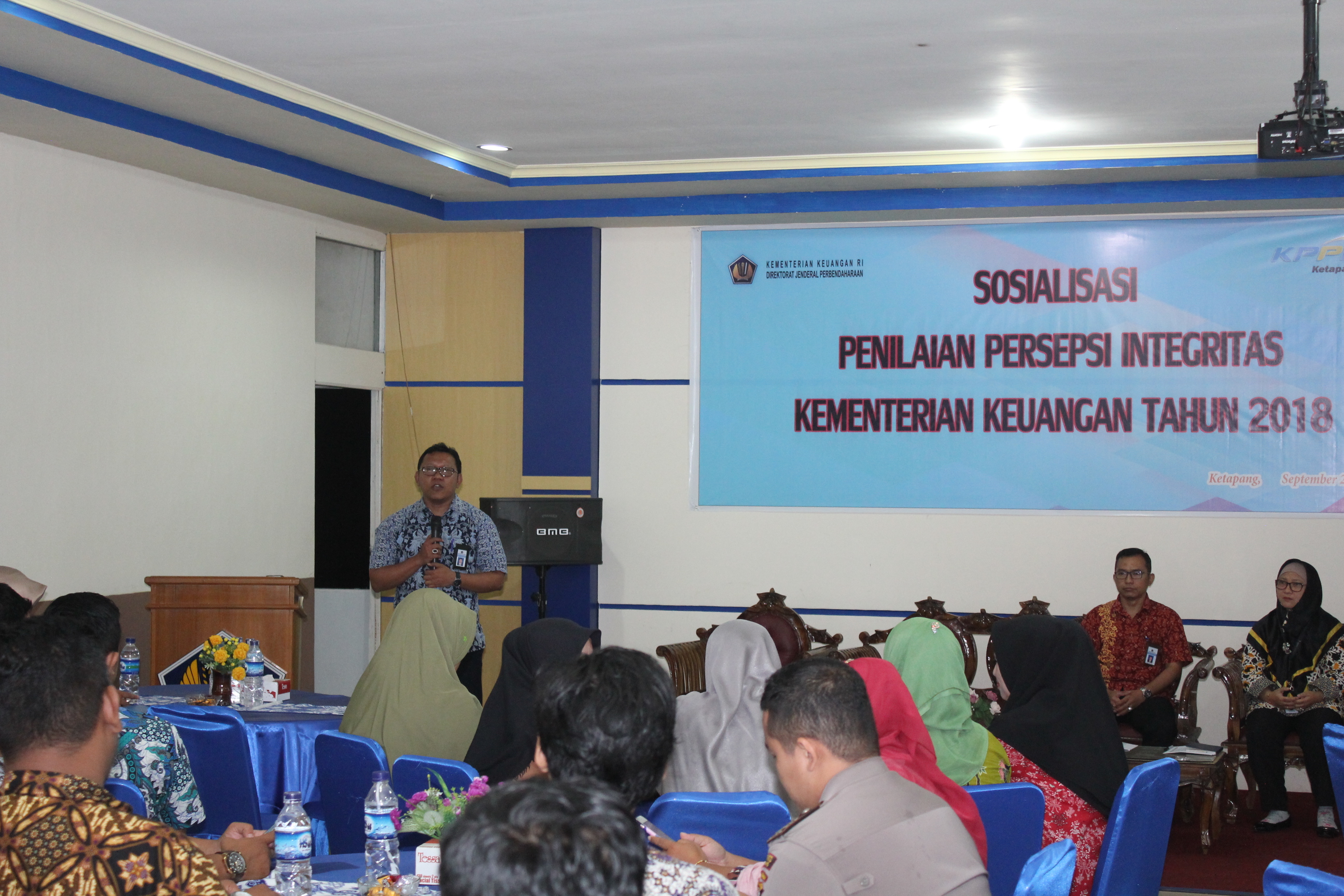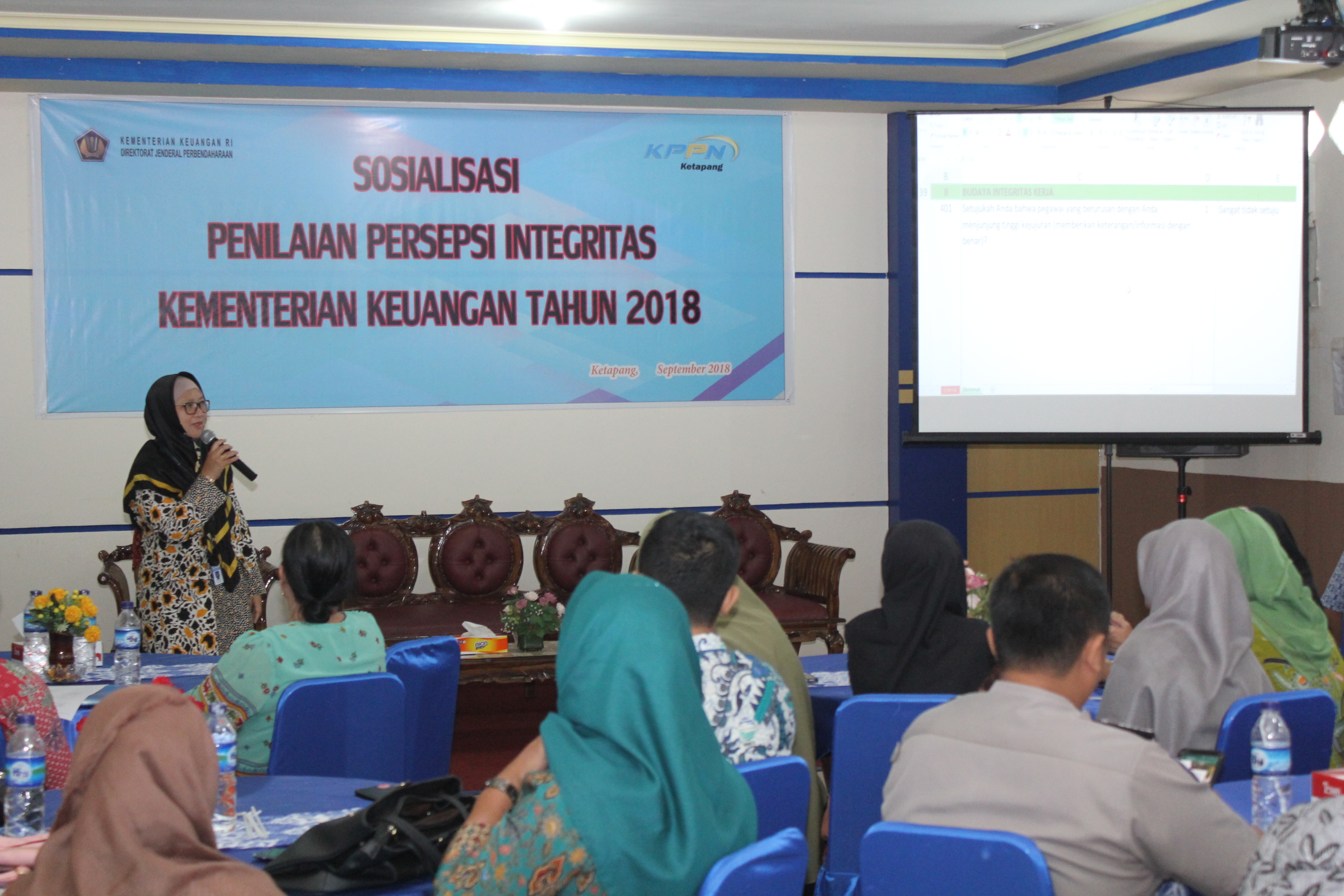 Indeks Persepsi Integritas merupakan IKU Kemenkeu Wide yang dicascading IKU Kemenkeu One. Indeks tersebut didapatkan dari hasil survei Persepsi Integritas. Direktorat Jenderal Perbendaharaan sebagai salah satu unit Eselon I Kementerian Keuangan juga melaksanakan survei Persepsi Integritas. Mengacu pada surat Sekretaris Ditjen Perbendaharaan Nomor S-7240/PB.1/2018 tanggal 19 September 2018 hal Penilaian Persepsi Integritas Kementerian Keuangan Tahun 2018 dan surat Kepala Kantor Wilayah Ditjen Perbendaharaan Provinsi Kalimantan Barat Nomor S-979/WPB.17/2018 tanggal 19 September 2018 Penilaian Persepsi Integritas Kementerian Keuangan Tahun 2018, KPPN Ketapang melaksanakan internalisasi Persepsi Integritas Kementerian Keuangan Tahun 2018 kepada satuan kerja mitra KPPN Ketapang yang dilaksanakan di Aula KPPN Ketapang pada Jumat, 28 September 2018.