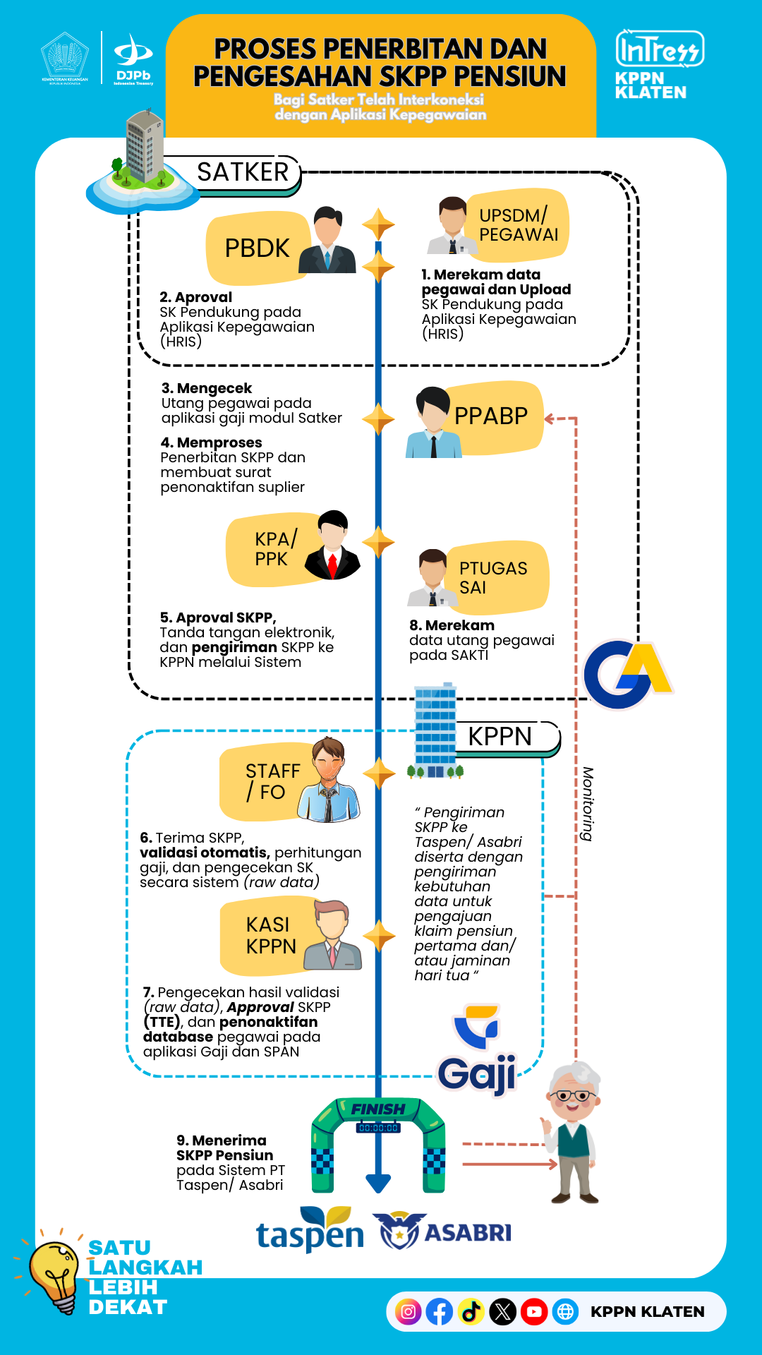 - Kepala Seksi Pencairan Dana/ Pencairan Dana dan Manajemen Satker melakukan penelitian atas hasil validasi SKPP. Apabila hasil penelitian telah sesuai, Kepala Seksi Pencairan Dnaa/ Pencairan Dana dan Manajemen Satker menonaktifkan data pegawai secara otomatis dan melakukan pengesahan terhadap SKPP.