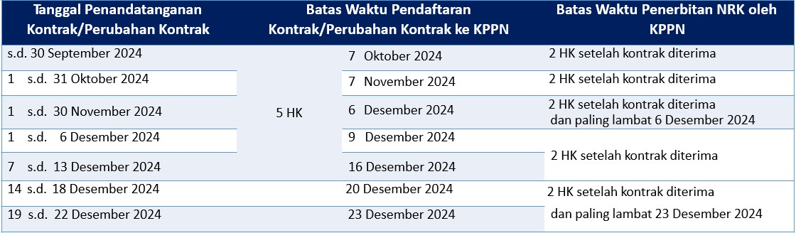 - diterima KPPN paling lambat tanggal 18 Desember 2024 pada Jam Kerja, diterbitkan paling lambat tanggal 23 Desember 2024.