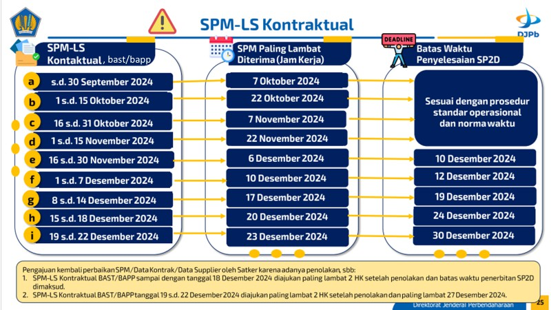 - Dalam hal KPPN melakukan penolakan atas pengajuan SPM-LS memerlukan perbaikan SPM dan/atau data supplier, pengajuan kembali SPM: paling lambat 2 (dua) Hari Kerja berikutnya pada Jam Kerja setelah ditolak oleh KPPN untuk penolakan sampai dengan tanggal 18 Desember 2024; dan b. paling lambat tanggal 20 Desember 2024 pada Jam Kerja untuk penolakan setelah tanggal 18 Desember 2024, dengan melampirkan bukti penolakan SPM dari KPPN dan diselesaikan paling lambat pada Hari Kerja berikutnya setelah perbaikan SPM diterima secara lengkap dan benar oleh KPPN.