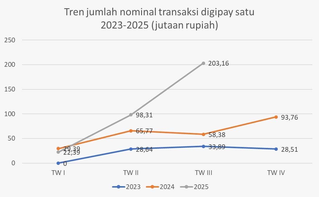Dilihat dari nilai nominal transanksi digipay satu 2023-2025 (jutaan rupiah), dengan adanya Inovasi lebih menjamin peningkataan nilai transanksi secara signifikan, sebagaimana terlihat dalam grafik berikut: