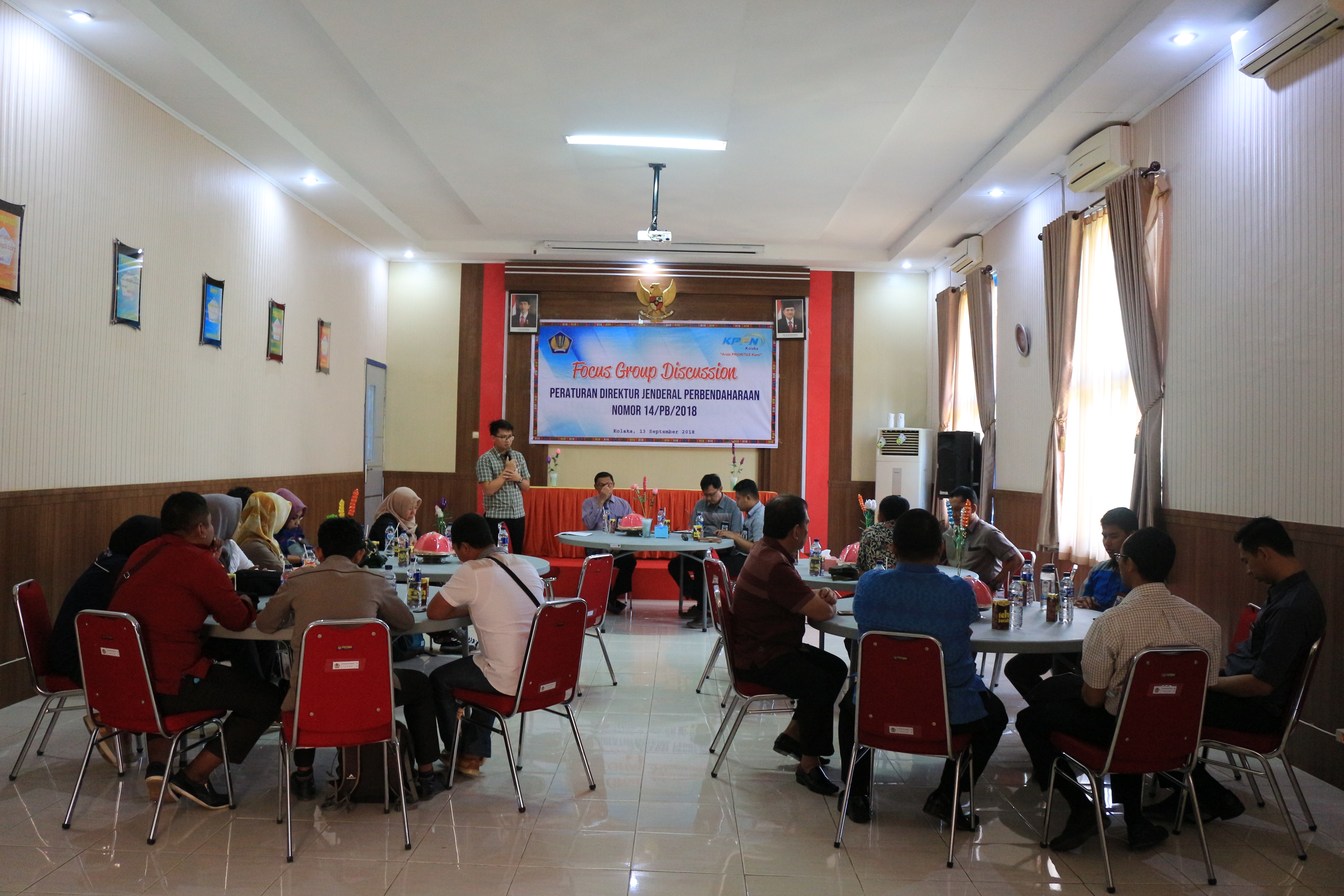 Kantor Pelayanan Perbendaharaan Negara (KPPN) Kolaka menyelenggarakan Focus Group Discussion (FGD) terkait dengan Peraturan Direktur Jenderal Perbendaharaan nomor PER-14/PB/2018 tentang Petunjuk Pelaksanaan Anggaran dalam Rangka Pelaksanaan Tahapan Pemilu Tahun 2019. Acara tersebut dilaksanakan di Aula KPPN Kolaka pada hari Kamis tanggal 13 September 2018. Acara dimulai tepat pada pukul 09.00 WITA. FGD dihadiri oleh rekan Satuan Kerja Komisi Pemilihan Umum (KPU) wilayah KPPN Kolaka yang terdiri dari KPU Kabupaten Kolaka, KPU Kabupaten Kolaka Timur dan KPU Kabupaten Kolaka Utara.