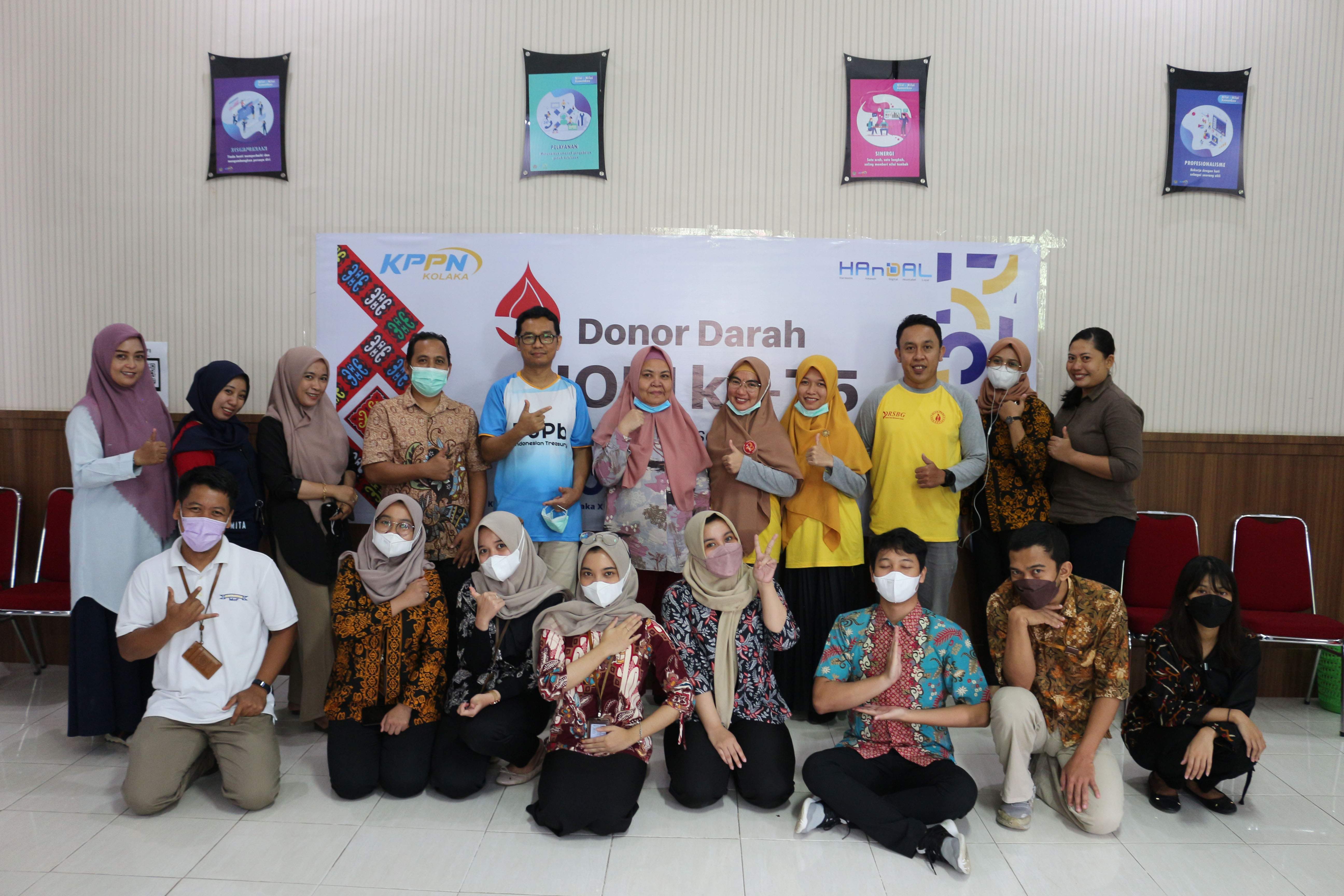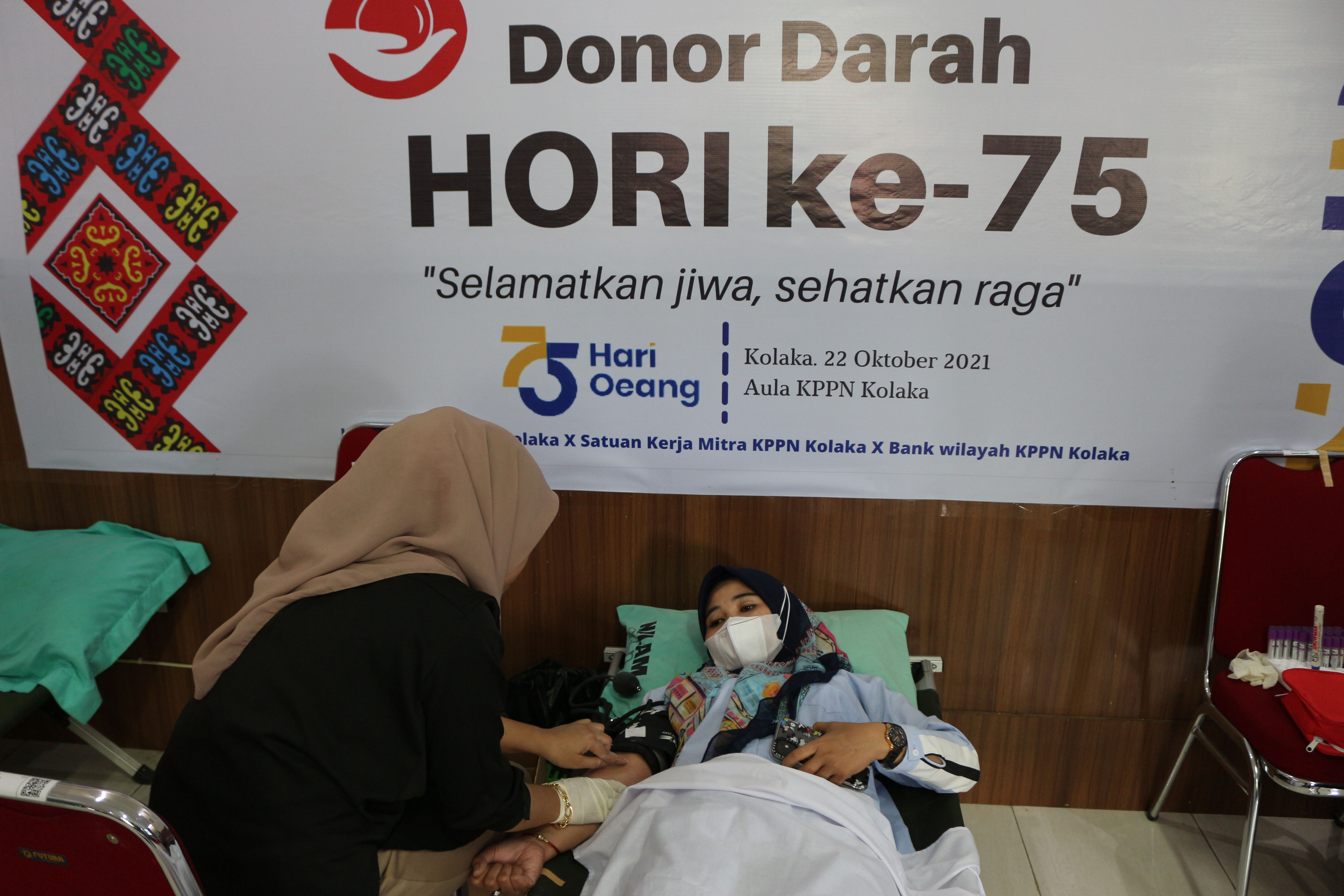 KPPN Kolaka melaksanakan Kegiatan Donor Darah pada hari Jumat (22/10/2021) dalam Rangka Memperingati Hari Oeang Republik Indonesia (HORI) ke-75. Kegiatan ini merupakan rangkaian dari pelayanan masyarakat yang dilaksanakan oleh KPPN Kolaka. Pada kegiatan ini, KPPN Kolaka bekerja sama dengan Badan Layanan Umum Daerah (BLUD) Rumah Sakit Umum Daerah (RSUD) Benyamin Guluh dengan melibatkan stakeholder terkait seperti Satuan Kerja dan Perbankan. Meskipun dilaksanakan di masa pandemi, tidak menyurutkan niat para pendonor untuk dapat berkontribusi mengikuti aksi sosial ini. Diharapkan, darah yang disumbangkan dapat membantu orang-orang yang membutuhkan. Tidak lupa, segenap panitia dan peserta tetap menerapkan protokol kesehatan yang ketat dengan mencuci tangan, mengenakan masker, dan menjaga jarak.