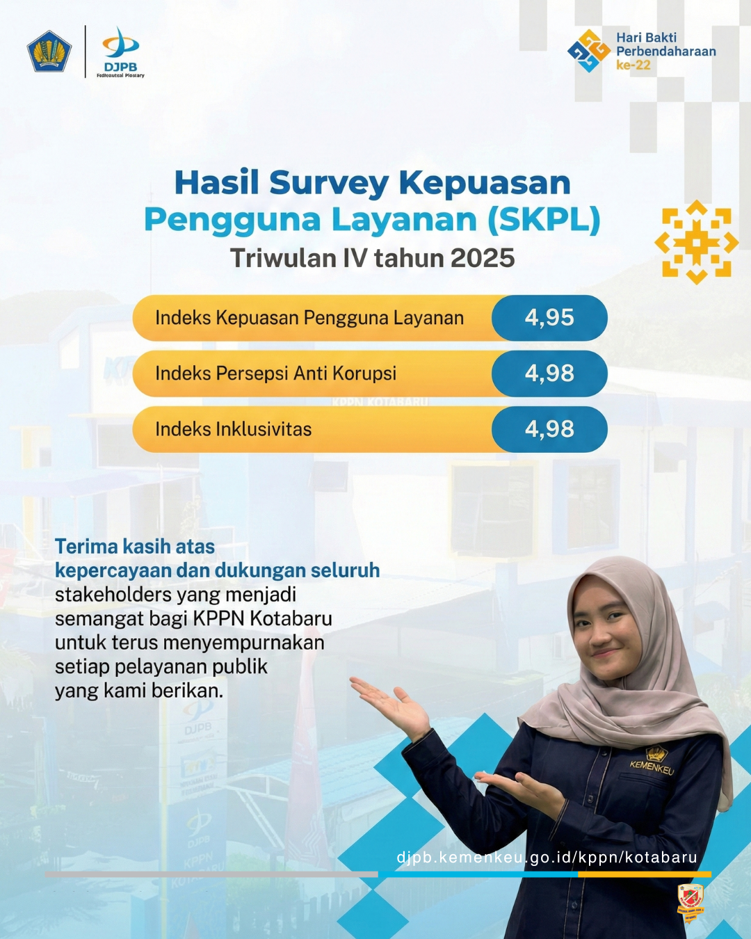 Terima kasih atas kepercayaan dan dukungan seluruh stakeholders yang telah menjadi energi bagi KPPN Kotabaru untuk terus memberikan pelayanan terbaik. Berdasarkan Hasil Survei Kepuasan Pengguna Layanan (SKPL) Triwulan IV Tahun 2025, KPPN Kotabaru berhasil meraih: