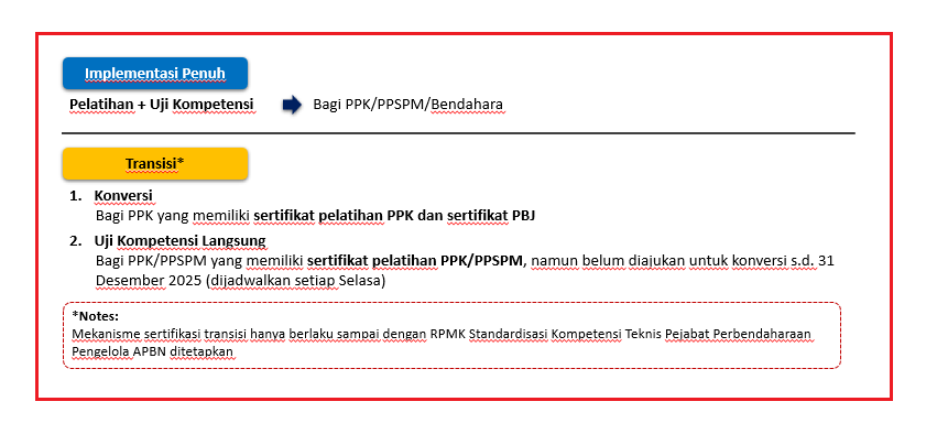 Ketentuan kewajiban sertifikasi kompetensi Bendahara sudah mulai berkalu sejak Januari 2020 sesuai Perpres Nomor 7 Tahun 2016, sedangkan PPK dan PPSPM wajib sejak 1 Januari 2026 sejak implementasi penuh PMK 211/PMK.05/2019. Dalam rangka pemenuhan ketentuan ini, berikut diinformasikan hal-hal terkait pelaksanaan Seritifikasi Pejabat Perbendaharaan