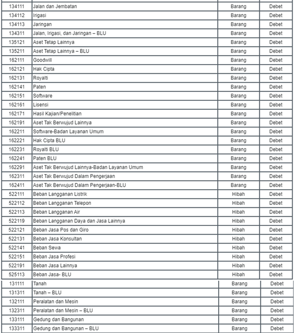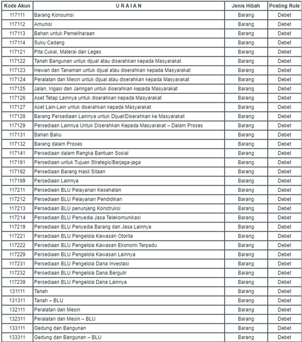 - Diisi kode akun Aset Tetap/ Aset Lainnya sesuai dengan jenis barang yang diterima dari donor, untuk mencatat hibah bentuk barang. Untuk pencantuman akun aset tetap agar menggunakan akun yang sama dengan perolehan selain dari hibah. Misal: untuk hibah langsung berupa tanah agar menggunakan akun 131111 (tanah), bukan menggunakan akun 131112 (Tanah dari Hibah).
