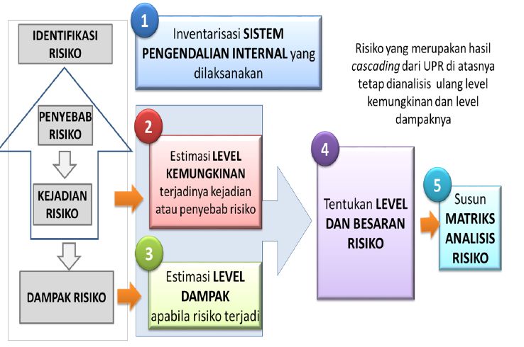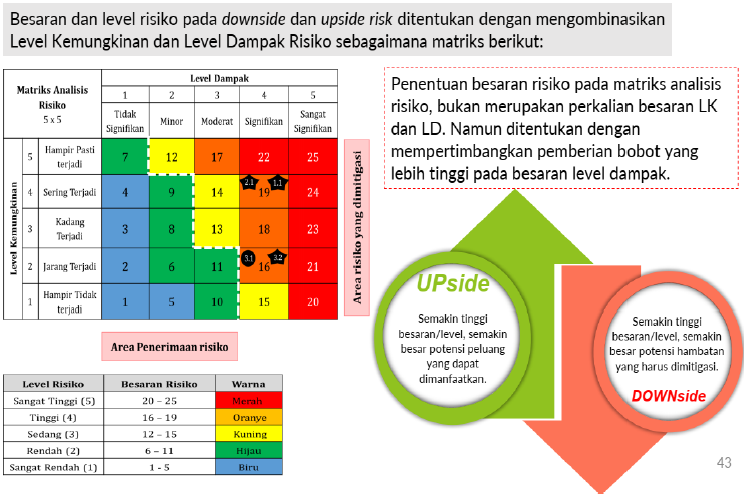 - Kriteria Dampak ada lima level, ditentukan secara hierarkis atas tujuh Area Dampak untuk downside risk) dan empat area dampak untuk upside risk) berdasarkan level jabatan