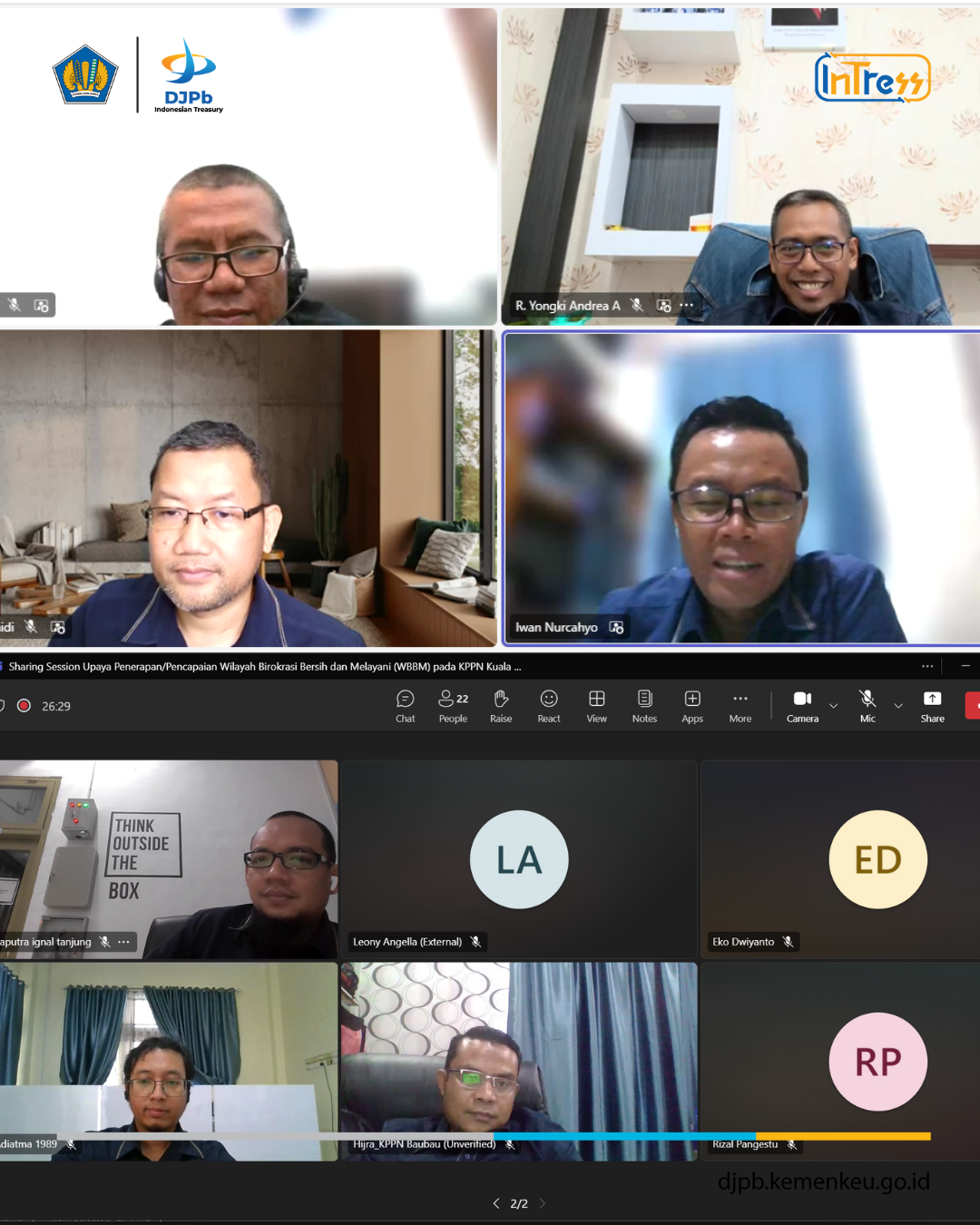 Pada Rabu, 05 Februari telah dilaksanakan Sharing Session Upaya Penerapan/Pencapaian Wilayah Birokrasi Bersih dan Melayani (WBBM) pada KPPN Kuala Tungkal yang menghadirkan tim dari KPPN Bau-Bau sebagai narasumber. Acara ini dihadiri langsung oleh Bapak Aang Junaidi selaku Kepala KPPN Bau-Bau, Bapak Yongki Andrea selaku Kepala KPPN Kuala Tungkal, Bapak Wahyu Widhianto selaku Kepala Bidang Pembinaan Akuntansi dan Pelaporan Keuangan Kanwil DJPb Provinsi Sulawesi Tenggara, Bapak Harada selaku Kepala Seksi Kepatuhan Internal, Bidang Supervisi KPPN dan Kepatuhan Internal, Kanwil DJPb Provinsi Jambi serta para pegawai lingkup KPPN Kuala Tungkal dan KPPN Bau-Bau.