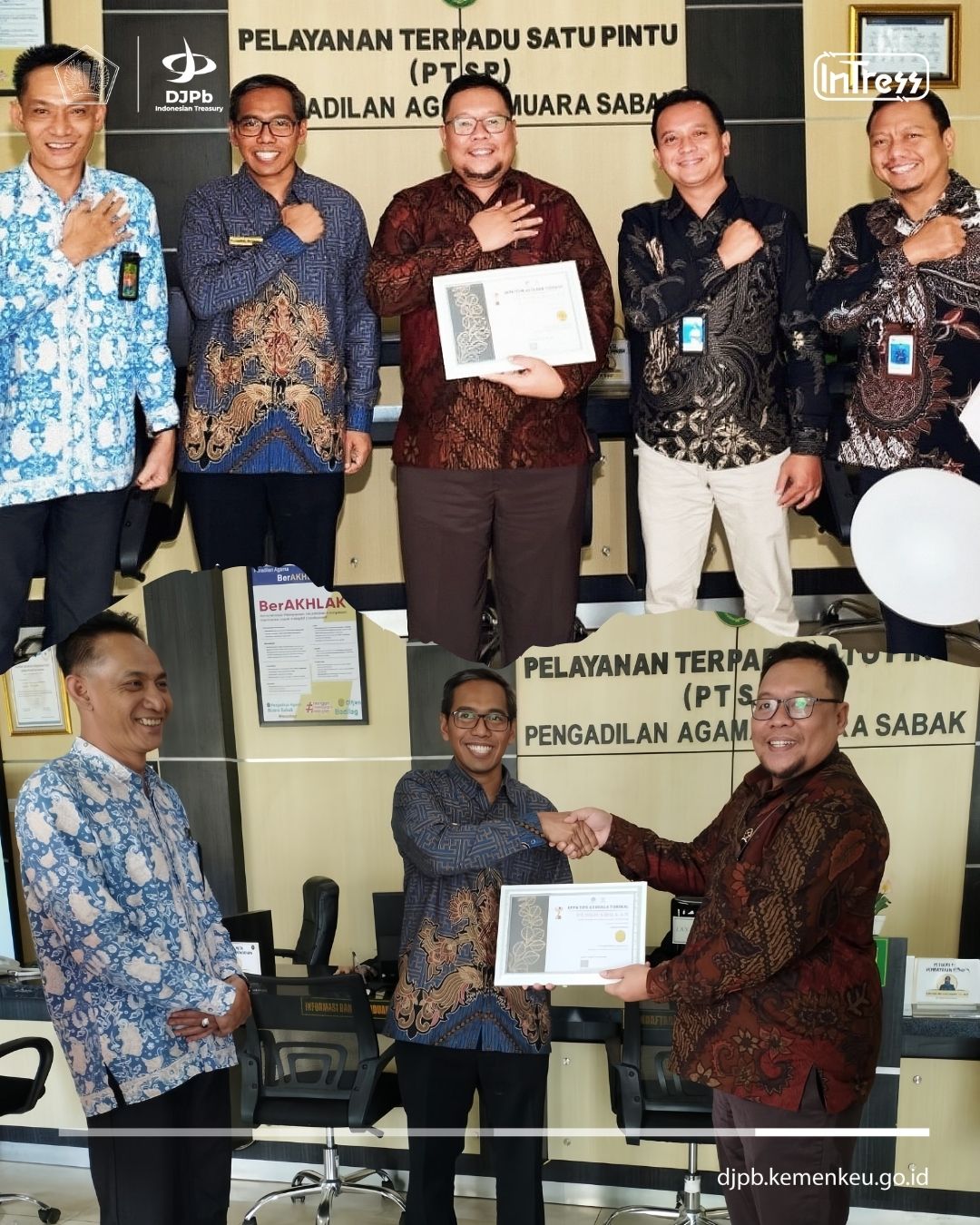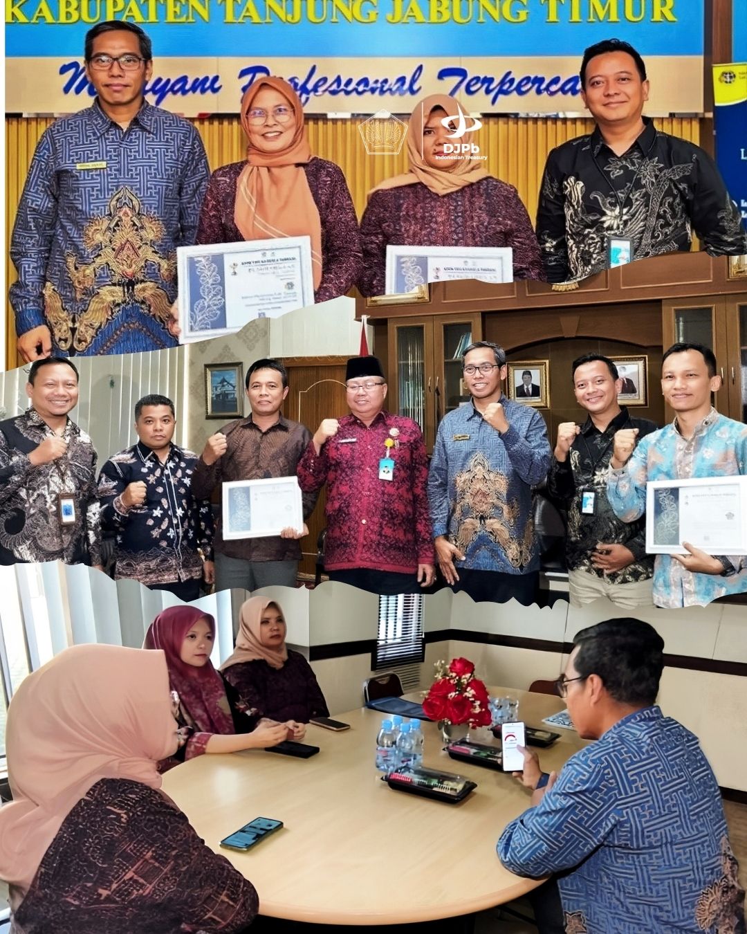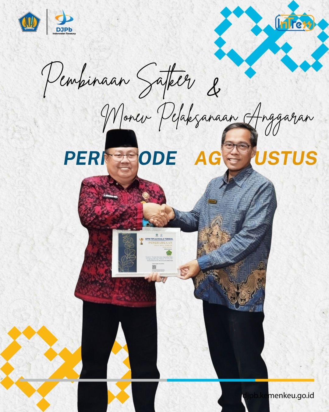 Pada tanggal 7 Agustus 2025, KPPN Kuala Tungkal melaksanakan kegiatan pembinaan satker dan monitoring & evaluasi pelaksanaan anggaran di tiga satuan kerja, yaitu Kantor pertanahanan Tanjabtim, Pengadilan Agama Muara Sabak, dan Kementerian Agama Kab. Tanjung Jabung Timur. Kegiatan ini bertujuan untuk meningkatkan pemahaman satker terkait pengelolaan anggaran yang efektif, akuntabel, dan tepat sasaran, mengidentifikasi kendala yang dihadapi dalam pelaksanaan anggaran, serta memastikan kualitas kinerja dan kepatuhan terhadap regulasi yang berlaku. Dalam kesempatan tersebut, KPPN juga menyerahkan sertifikat Tangguh Awards Semester I Tahun 2025 kepada satker berprestasi, sebagai bentuk apresiasi atas kinerja terbaik yang telah dicapai. Selain itu, turut diperkenalkan hasil assessment satker yang memuat informasi mengenai kualitas kinerja, profil digitalisasi, profil risiko, serta rekomendasi peningkatan kinerja. Pengenalan hasil assessment ini bermanfaat bagi satker untuk memperoleh gambaran menyeluruh terkait posisi dan capaian saat ini, potensi pengembangan, serta langkah strategis yang dapat diambil untuk meningkatkan kualitas layanan dan tata kelola keuangan.