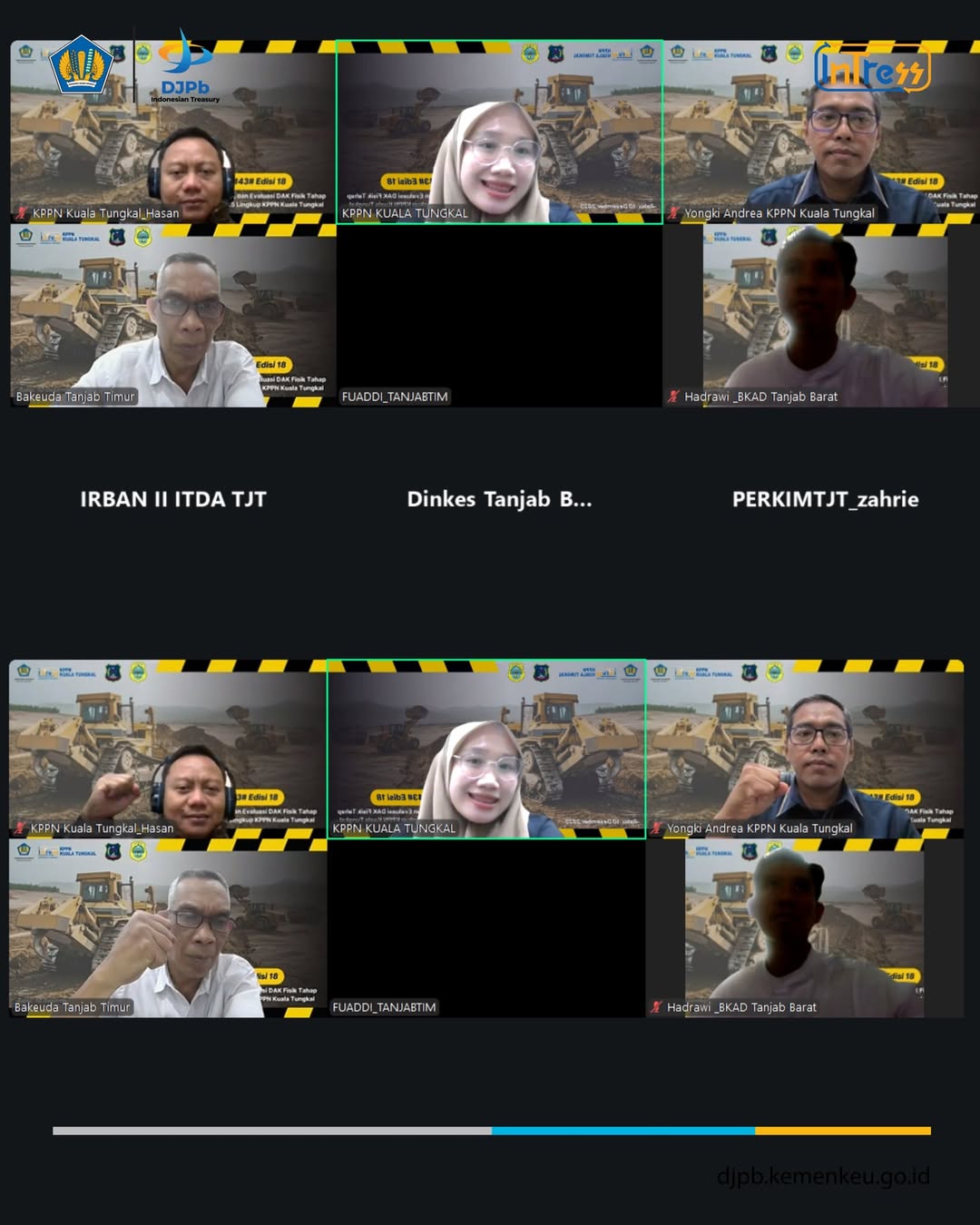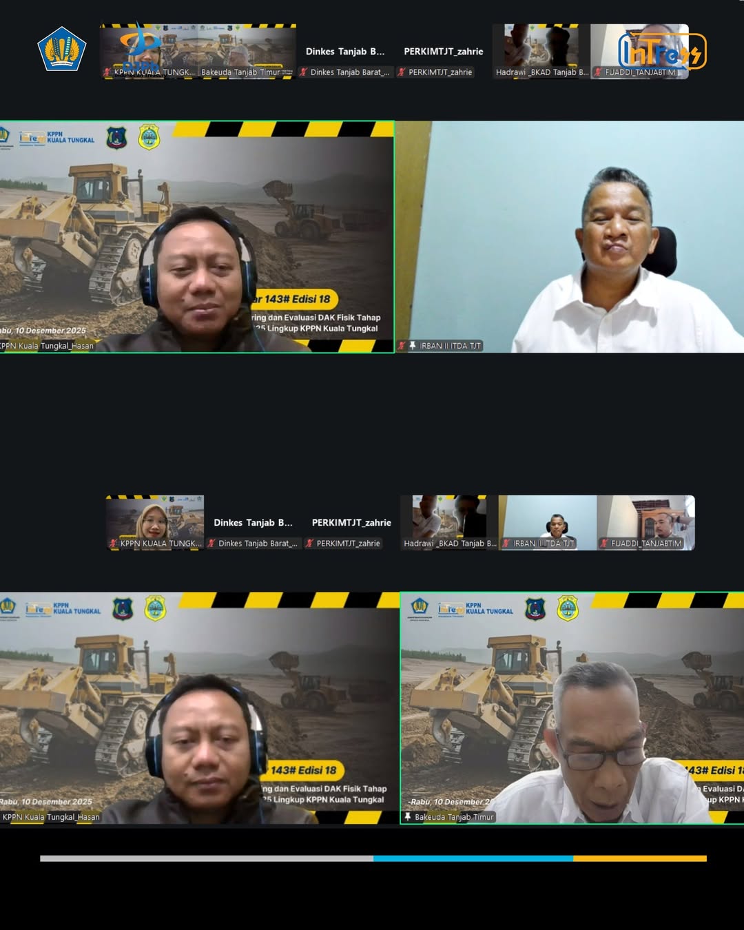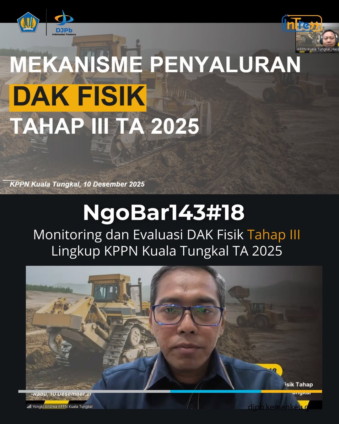 KPPN Kuala Tungkal melaksanakan NgoBar143 Edisi 18: "Monitoring dan Evaluasi DAK Fisik Tahap III TA 2025" secara daring melalui zoom meeting pada hari Rabu, 10 Desember 2025 pukul 10.00 s.d. 12.00 WIB. Kegiatan ini dibuka oleh Kepala KPPN Kuala Tungkal, Yongki Andrea. Disampaikan apresiasi atas penyaluran DAK Fisik Tahap III TA 2025 di Kab. Tanjung Jabung Barat sudah tersalurkan untuk semua subbidang, dan Kab. Tanjung Jabung Timur sudah berprogress dan sedang menunggu penandatanganan dari kepala daerah .