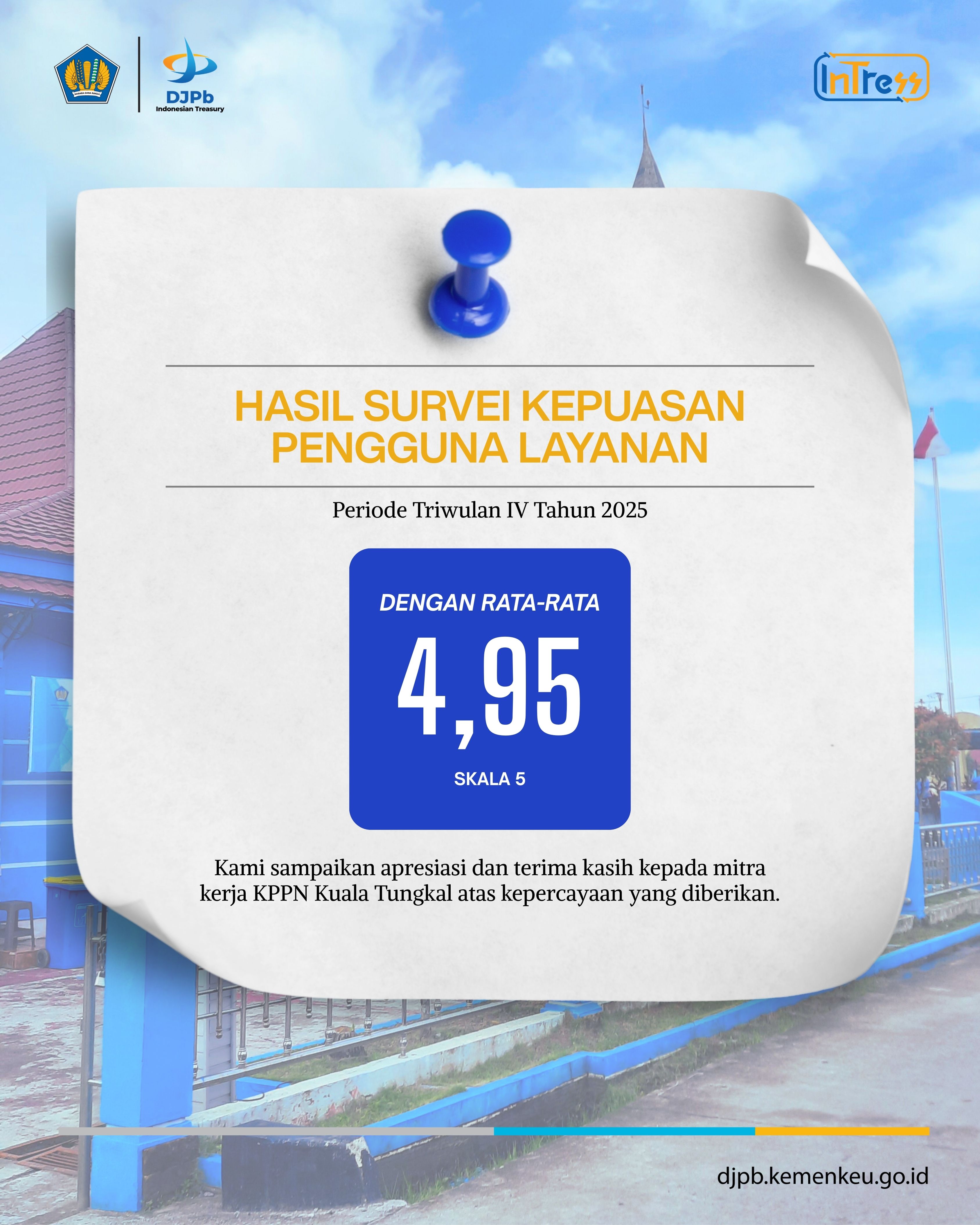 Kami mengucapkan terima kasih yang sebesar-besarnya kepada seluruh Mitra Kerja/Stakeholder atas partisipasinya dalam Survei Kepuasan Pengguna Layanan periode Triwulan IV Tahun 2025, dengan tingkat kepuasan secara umum adalah 4,95 (skala 5). Survei ini terdiri dari tiga indeks utama, yaitu Indeks Kepuasan Pengguna Layanan, Indeks Persepsi Anti Korupsi, dan Indeks Inklusivitas.