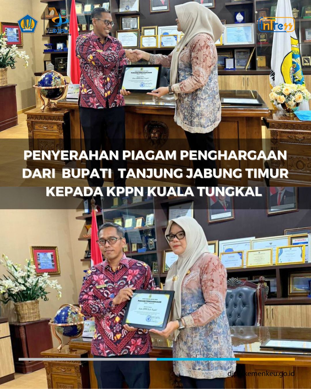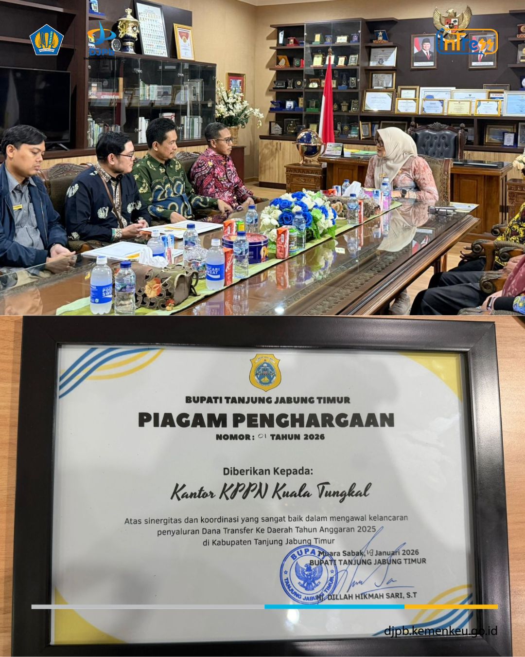Kamis, 22 Januari 2026, Bupati Tanjung Jabung Timur, Hj. Dillah Hikmah Sari, S.T. menyerahkan Piagam Penghargaan Kepada KPPN Kuala Tungkal atas Sinergitas dan Koordinasi yang sangat baik dalam mengawal kelancaran penyaluran Dana Transfer Ke Daerah TA 2025 di Kab. Tanjung Jabung Timur.