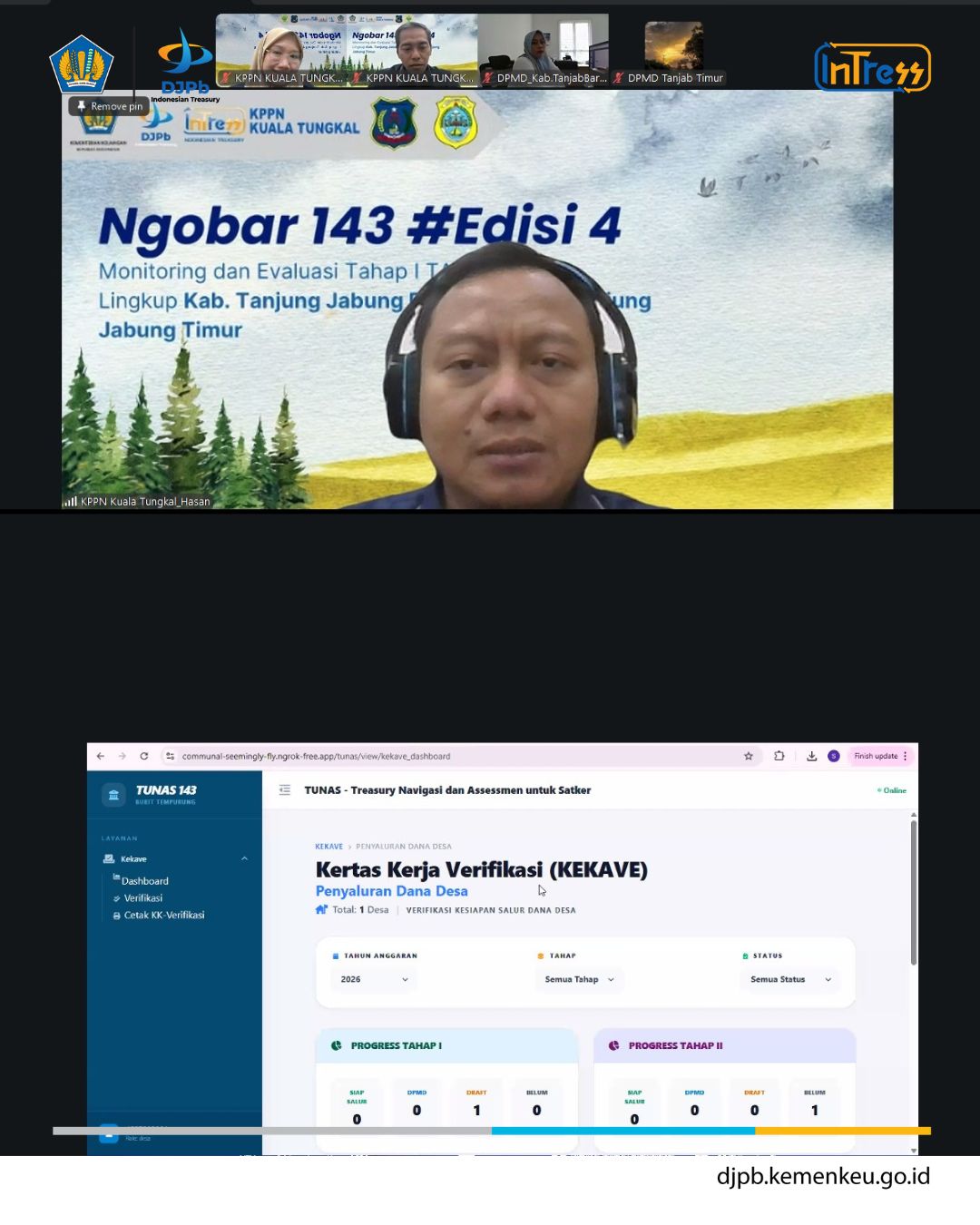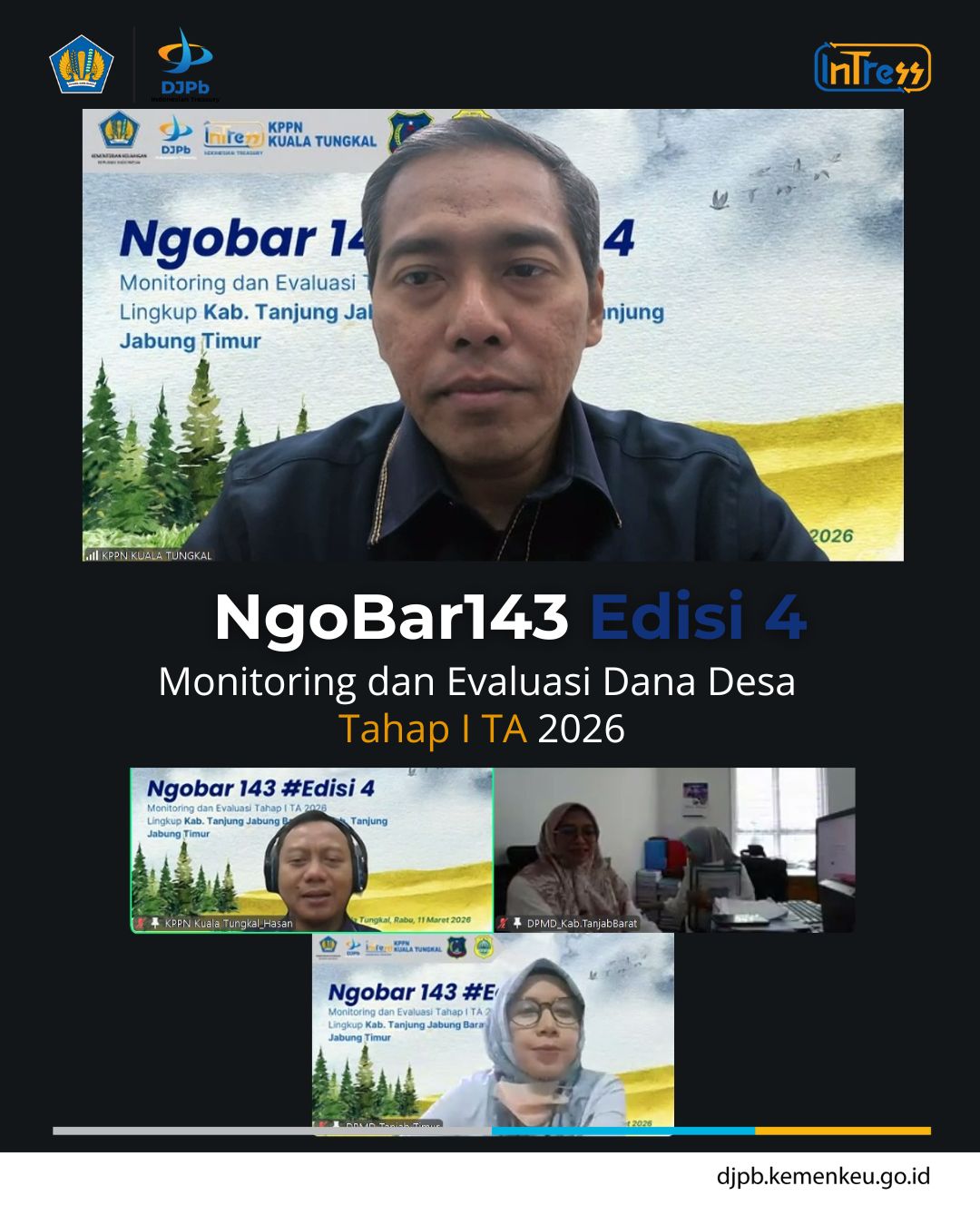 KPPN Kuala Tungkal melaksanakan NgoBar143 Edisi 4: "Monitoring dan Evaluasi Dana Desa Tahap I TA 2026" secara daring melalui zoom meeting pada hari Rabu, 11 Maret 2026 pukul 10.00 s.d. 12.00 WIB. Kegiatan ini dibuka oleh Kepala KPPN Kuala Tungkal, Yongki Andrea, dan disampaikan fokus kegiatan ini bukan hanya pada teknis dan administratif penyaluran dana desa, namun dapat dijadikan forum diskusi bersama bagaimana agar dana desa bisa disalurkan tepat waktu, serta tidak menyisakan isu dan kendala termasuk perkara hukum.