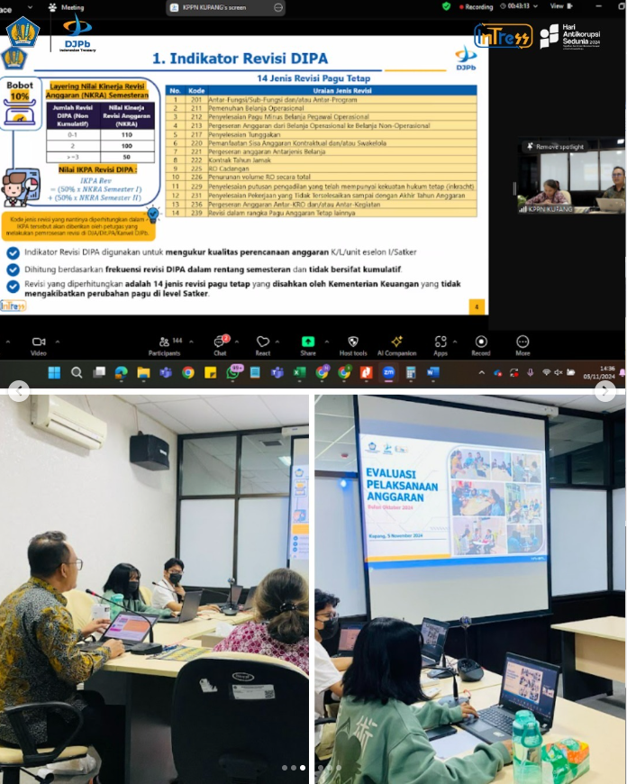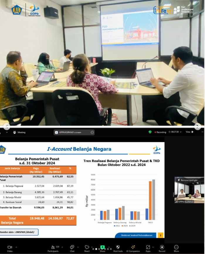Pada hari Senin (05/11) KPPN Kupang melaksanakan kegiatan FGD Perkembangan APBN dan Evaluasi Pelaksanaan Anggaran s.d. 31 Oktober 2024. Selain itu dilaksanakan juga kegiatan Asistensi Aplikasi SAKTI dan Evaluasi Implemntasi Pembayaran Digital s.d. Oktober 2024.