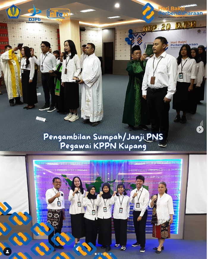 Semoga para PNS baru di lingkungan KPPN Kupang dapat memegang teguh janjinya dan menjadi PNS yang bersih, jujur, dan sadar akan tanggung jawabnya sebagai unsur Aparatur Negara, Abdi Negara, dan Abdi Masyarakat.