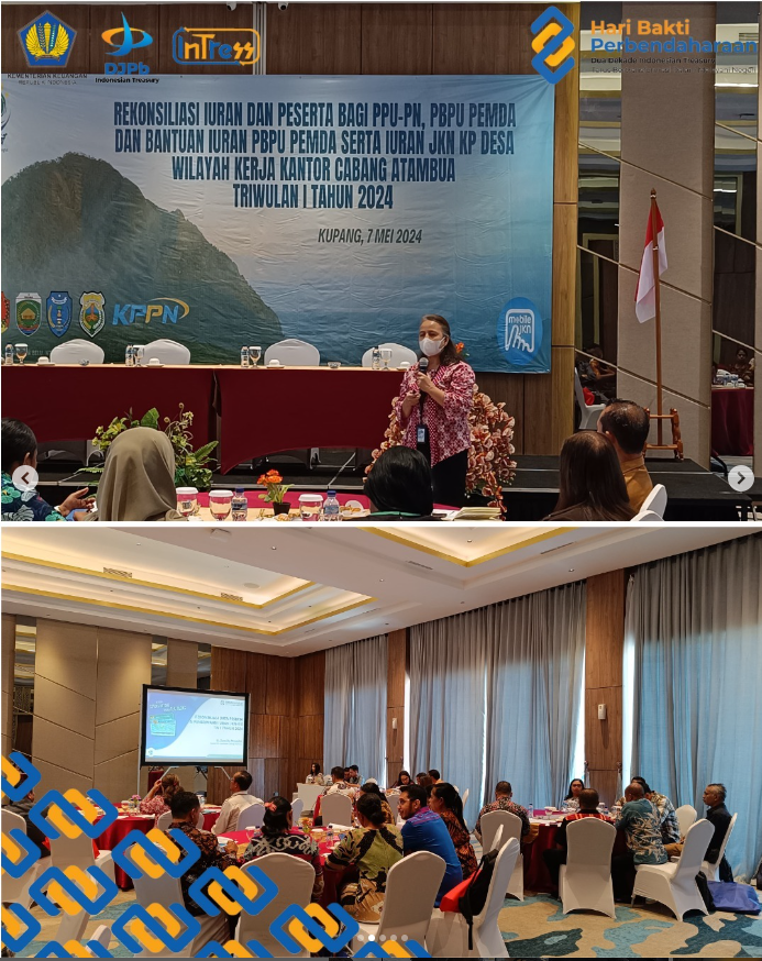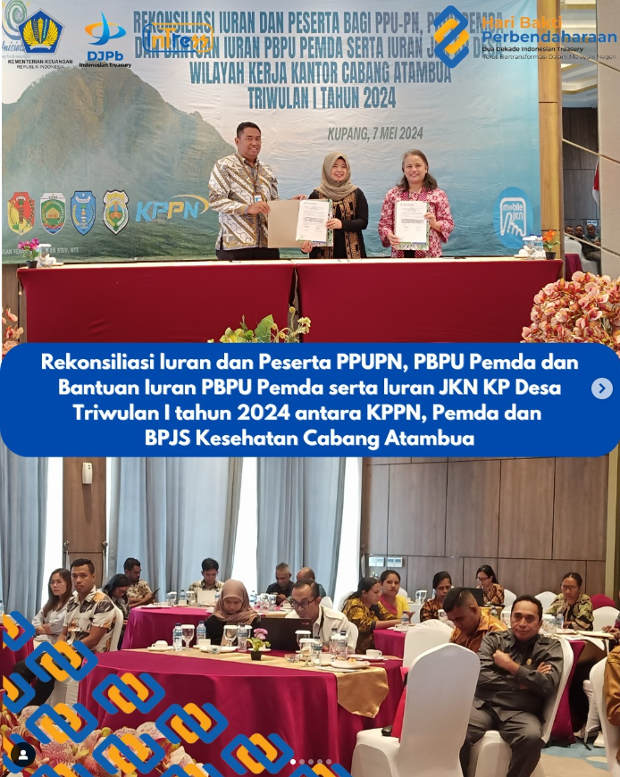Kepala KPPN Kupang beserta Kepala Seksi dan Staf Seksi Bank mengikuti acara Rekonsiliasi Iuran dan Peserta PPUPN, PBPU Pemda dan Bantuan Iuran PBPU Pemda serta Iuran JKN KP Desa Periode Triwulan I tahun 2024 pada hari Selasa, 07 Mei 2024. Kegiatan rekonsiliasi dilaksanakan antara KPPN Kupang, KPPN Atambua, Pemda dalam wilayah kerja BPJS Cabang Atamtua (khususnya Pemda Kab. TTS) dan BPJS Kesehatan Cabang Atambua.